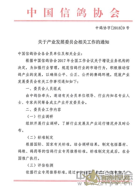 中国信鸽协会关于产业发展委员会相关工作的通知
