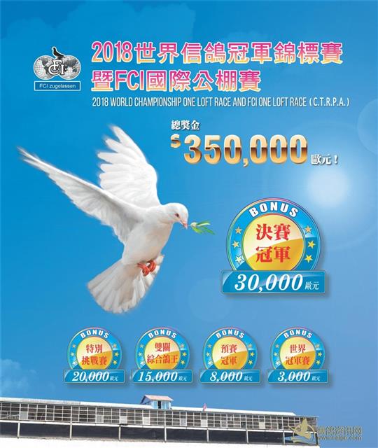 3月27日,中国信鸽运动将史无前例引爆世界! 明天,3月27日,随着2018世界信鸽冠军锦标赛暨FCI国际公棚赛决赛在台湾桃园开赛,同时2018第三届“正大杯”金鸽奖颁奖盛典暨中国信鸽产业高峰论坛在北京举行,中国信鸽运动将迎来史无前例的一天! 2018世界信鸽冠军锦标赛 暨FCI国际公棚赛决赛