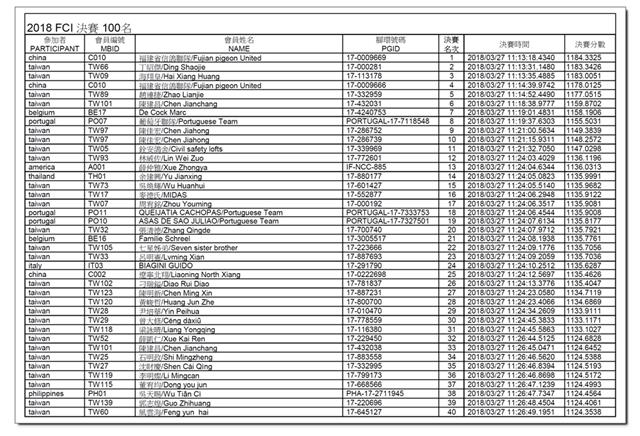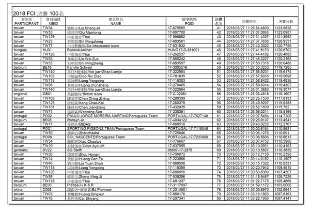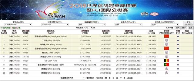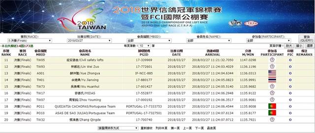 冠军和第四名由福建省信鸽连队夺得,台湾台北队摘得银牌和铜牌!前五名两岸全包了实在太强了呵呵。 福建省信鸽联队为国争光,获得决赛冠军、4位。台湾地区丁绍杰、海翔皇,分获2、3位。葡萄牙连队获8位。台湾陈佳宏获9、10位。预赛6位得主吴焕辉决赛获15位、99位。前20位中国选手进奖14羽,为国争光!