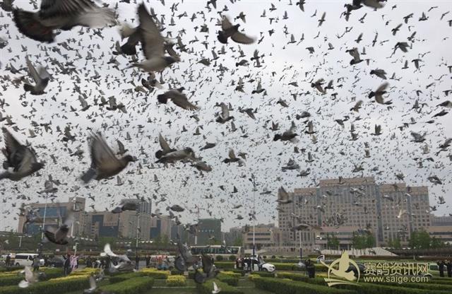 2018年4月23日晨6点32分,北京市信鸽协会13区30939羽赛鸽在河南省新乡市政府广场放飞成功! 北京市第十届体育大会信鸽550公里(新乡—北京)、感谢河南省新乡市体育局大力支持、河南省信鸽协会祝北京市全市大联翔圆满成功的三组横幅悬挂在司放现场。