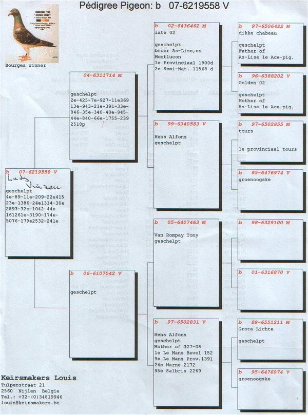 ''威尔森小姐"的父亲04-714斑雄赢得2/425, 7/927, 11/369, 13/943, 21/391, 33/846, 40/945, 44/840, 66/1755…等成绩,是02-462 2004蒙特路康1800羽全省冠军和2005蒙特路康半全国11568羽2位的直子。母亲06-412也是羽斑色种鸽(同母半姐妹赢得利曼斯192羽冠军/全省1391羽9位)。