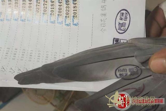 成绩直播平台显示的前10羽归巣鸽 经过了8个小时的飞行,极速鸽舍的一羽环号为002262的参赛鸽于15时54分04.98秒率先归巢。 根据《2018年“中国杯”信鸽职业联赛(开创者站)开创者(北京)“铁鹰四关” 鸽王大奖赛竞赛规程》第八项第(五)条中第2项规定:为严防作弊,每关均采取封闭参赛鸽足环措施。各关比赛结束后三小时内,所有参赛者须携当日归巢鸽及计时鸽钟到比赛承办单位报到检验赛鸽,若发生赛鸽足环封条破损,此赛鸽将失去比赛资格。 以下是第三关河南封丘俱乐部现场验鸽图片: