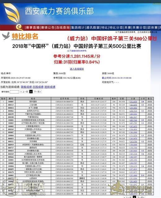 2018年秋赛逐渐进入高潮, “中国杯”(威力站)中国好鸽子秋季幼鸽五关赛“第二关共集鸽5093羽, 10月22日早上7点29分于晋中开赛, 空距约500公里。此关预计并不好飞, 首段逆风, 沿途多有雾霾, 后段才能见阳光, 但是依然是顶风。近七小时后, 两羽鸽子并肩从东边飞入院内, 同时降落在7号棚,前后踏过扫描板,屏幕显示7号棚新加坡阳升国际夺得冠-亚军,分速是1239.70和1239.64, 现场鸽友热烈称许!