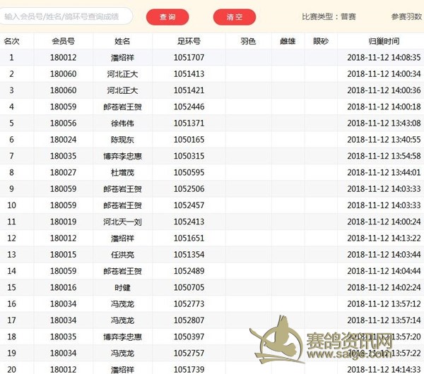石家庄裕通2018年秋季“钻石王中王”专环赛绝杀关牵动人心,从11月5日第一次集鸽,到11月12日正式开笼,历经数次波折,今天终于平安归巢。 11月5日首次集鸽,由于放飞地天气一直下雨,赛鸽被迫拉回俱乐部等待时机。11月10日,俱乐部第二次集鸽,不巧的是,放飞地再次出现阴雨天,赛鸽压笼一天。今日早上7:27,放飞车在宿州开笼,尽管放飞地天气多云有浓雾,以及压笼一天,在如此艰难的情况下,多数赛鸽依然安全归巢。祝贺俱乐部和参赛鸽友! 截至12日下午17:00,所有503羽参赛鸽中,已经归巢339羽。来自鸽友潘绍祥的赛鸽以1289.1617分速夺得决赛冠军,环号1051707。河北正大的两羽赛鸽几乎同时归巢,获得亚军和季军。 第四关前20位