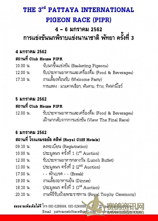 泰国芭提雅国际公棚530公里总决赛于当地时间2019年1月5日早上开笼放飞,共计参赛鸽959羽,其中中国赛鸽198羽。