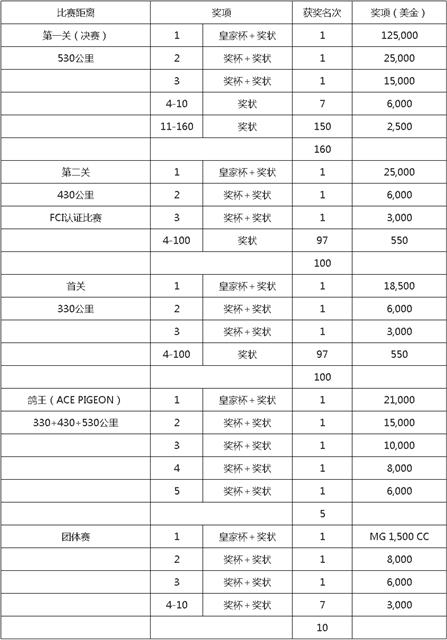 鸽王奖项:在全三关:330,430,530公里有入排名的鸽子将有资格获取鸽王奖项,三关总分最低参赛者为胜,若有相同成绩,决赛名次列前者为胜。