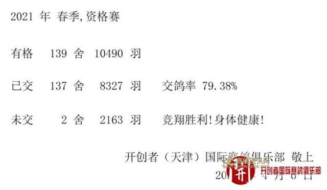 4月5日下午17:00,2021年‘中国杯’信鸽职业联赛天津(开创者站)春季一岁鸽全球精英四关挑战赛资格赛集鸽工作正式开始。此次集鸽由天津市信鸽协会委派的10位裁判员、各大高等院校的25位志愿者、俱乐部的工作人员共同完成的。晚上00:15分,集鸽完毕,共有137家鸽舍的8327羽赛鸽上笼。在此预祝各位鸽友取得好成绩!