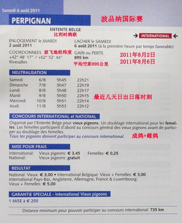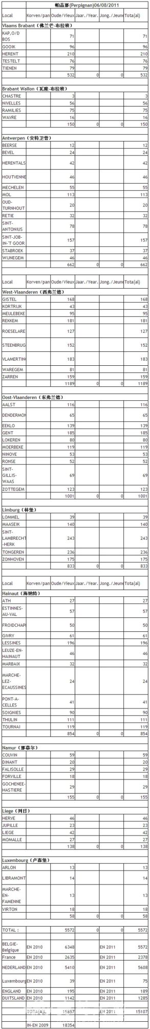 作为备受鸽友关注的今年最后一场国际大赛帕品那(Perpignan)国际赛,是2011年最后的国际赛焦点,值得一提的是在去年(2010年)的比赛中,比利时显现出了它的王者风范,比利时的参赛羽数最多,实力也是最强。比利时赢得国际总冠军及国际前十名中的8个名额,这是非常棒的成绩,今年的比利时是否能续写辉煌,让我们拭目以待!