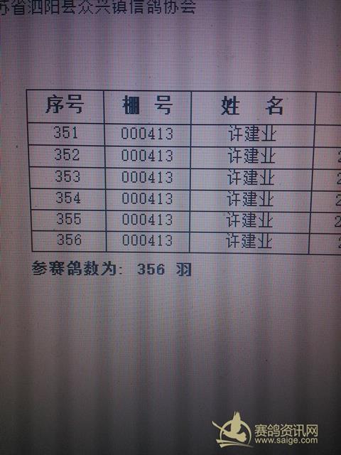 在做到“三公”的同时,还要具备足够的透明度,也是从新年的第一场比赛开始,以后每一场集鸽完毕,我们都会直接以图片形式公布集鸽羽数,然后严格按照“十取一”的比例录取获奖名次,不偏不倚,不隐不藏,从而彻底调动广大鸽友们的参赛热情。按“十取一”比例录取名次,是我们鸽会新的一年的几大变化之一。 而这一场比赛共集鸽356羽,录取前35名。