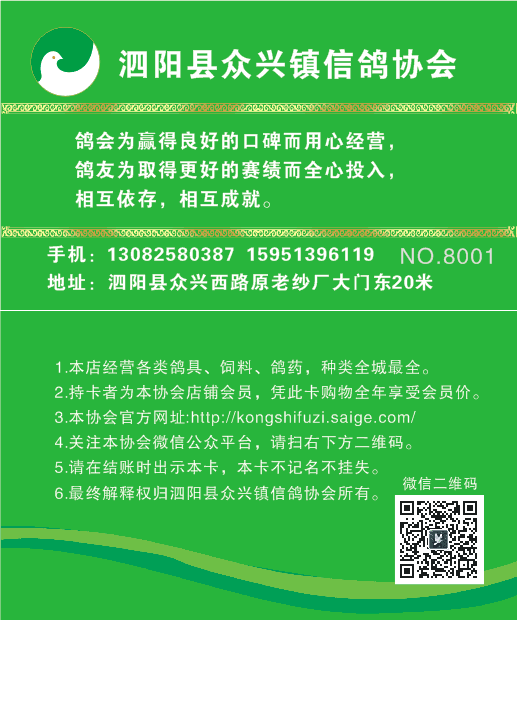 第三轮活动我们主推会员卡,相信已经有很多鸽友领取到了,并且我们让获得会员卡的鸽友在这次开封加站赛中提前享受了一次会员卡带来的优惠。这张会员卡由我们请的广告制作人员精心设计、制作而成,我们特地选了草绿色为它的主打色,因为清新的绿色往往代表的是盎然的生机、旺盛的生命力,是一种健康的颜色,寓意我们众兴鸽协不管经历多少风吹雨打,都能够傲然屹立,欣欣向荣;不管外界如何风云变幻,都能够保持本色,不忘初心,以自己的节奏一步一个脚印地走出自己的一片天。