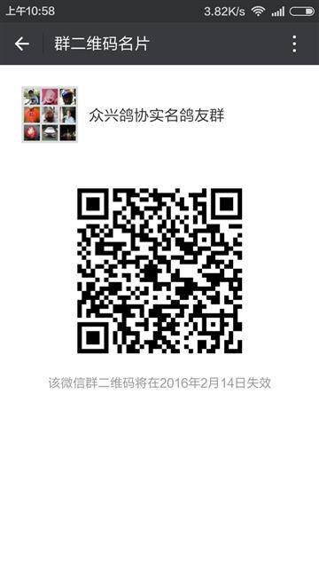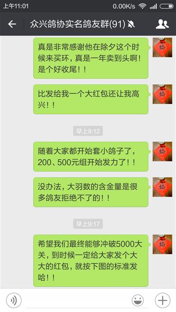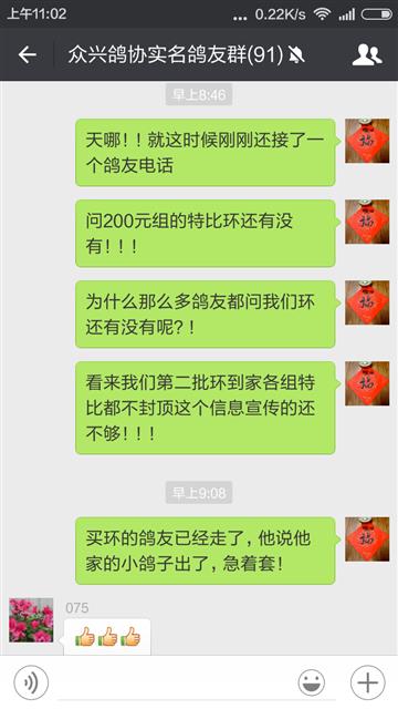 今天真是非常高兴,真没想到大年三十一大早晨还有鸽友来鸽会买特比环,真是万分感谢鸽友们的厚爱与支持! 今年我们一定会努力把比赛搞好,给广大鸽友们奉献一场巅峰赛事! 还没进群的鸽友们可以扫一下上面的二维码,进群来抢抢红包玩!