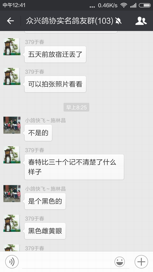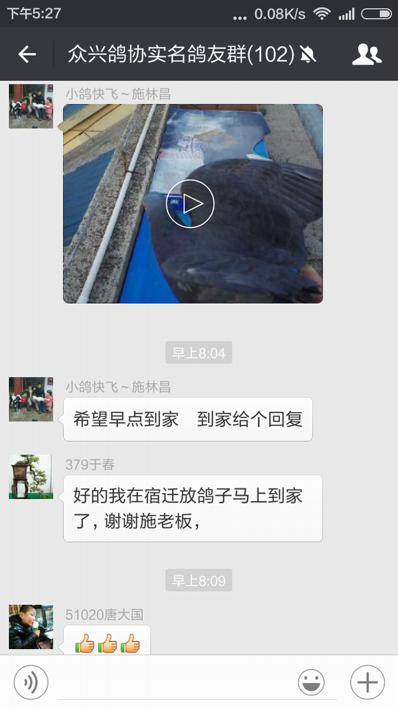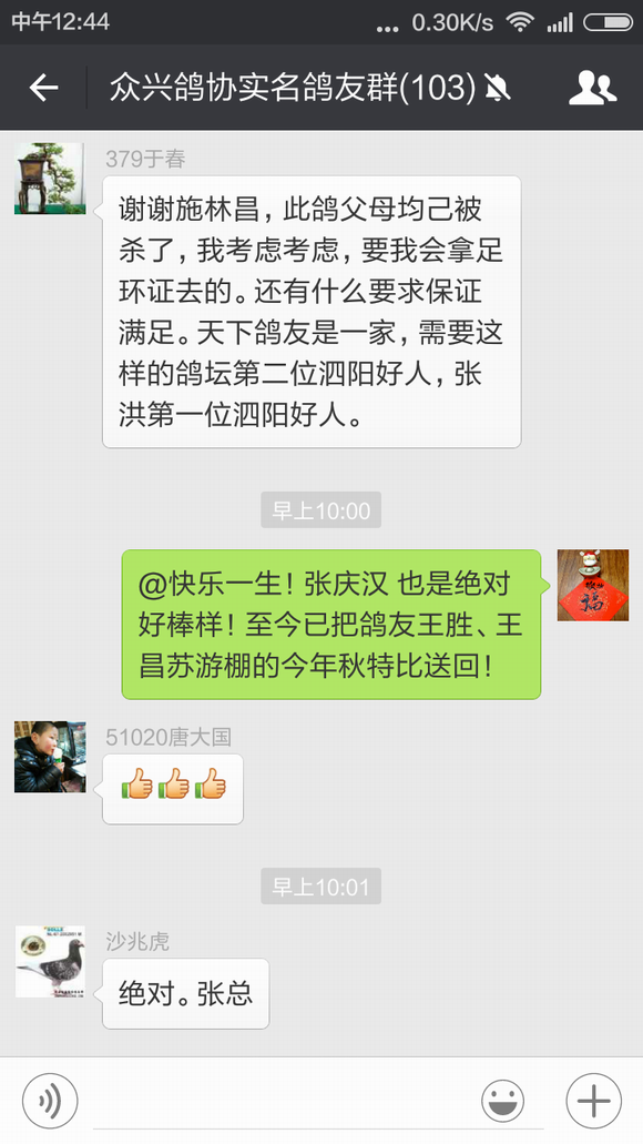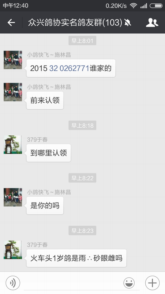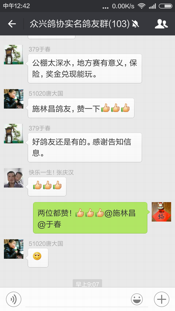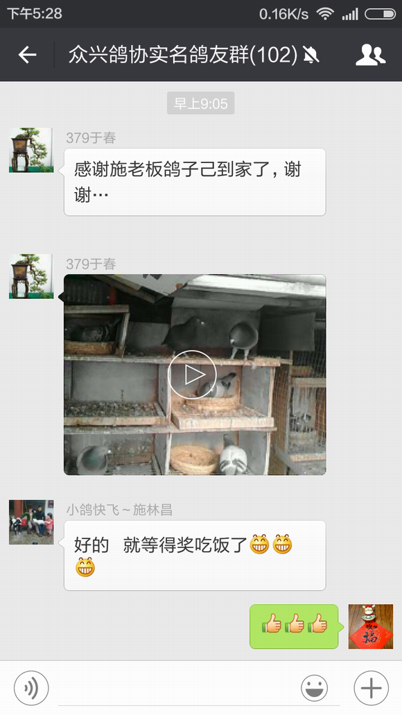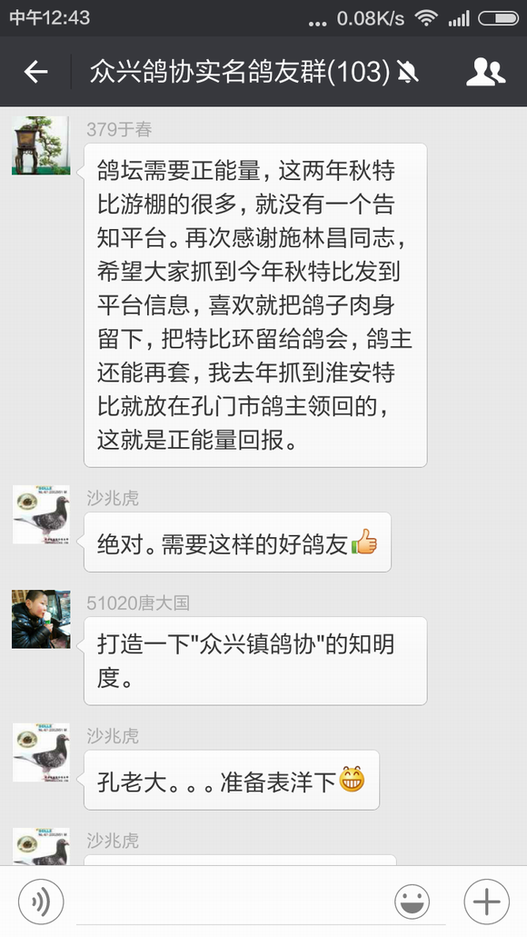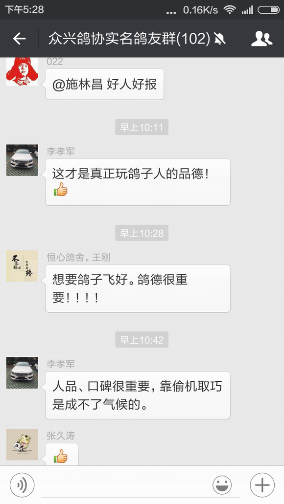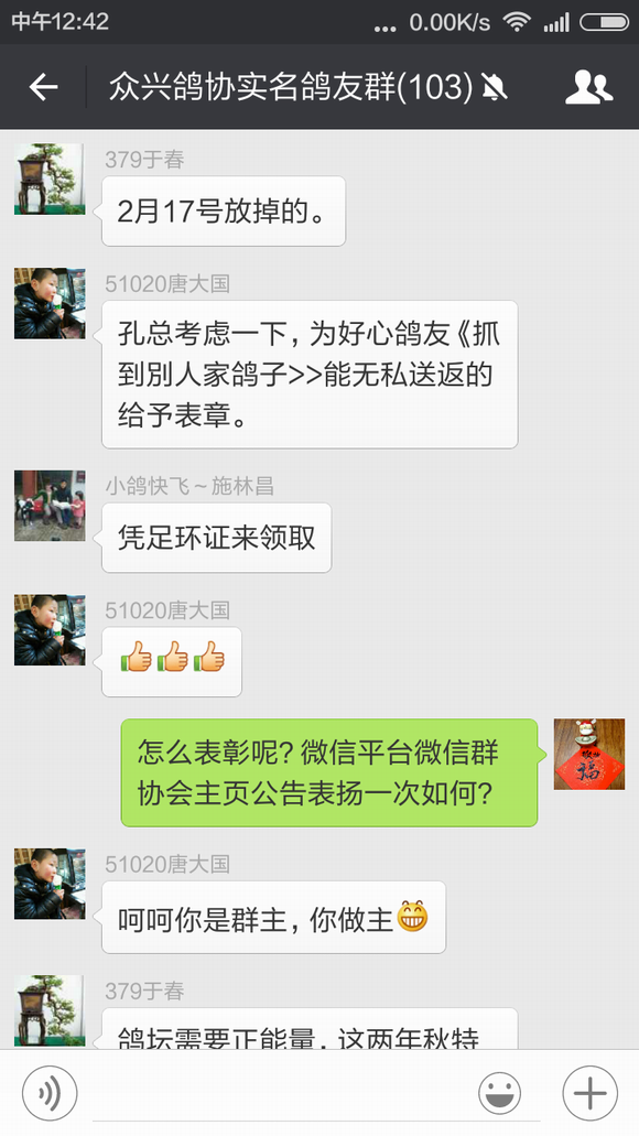 于春先生前几天训放丢了一只春特比,不过他的运气非常好,这只春特比飞到了施林昌先生的鸽棚中,施林昌先生发现后立即把足环号码报到我们鸽会群里寻找失主,于春先生看到足环号码认出是自己刚丢的鸽子,在和施林昌先生几番确认后,今天早晨这只鸽子已经回到了他的棚中。 鸽子训放丢失或游棚是让鸽友们很头痛的问题,相信每次遇到这样的事情鸽友们都会在心里祈祷鸽子能够尽快回来,而对逮到鸽子能够主动归还的鸽友那真是感激不尽!因此带有16年度首冠军光环的施林昌先生在群里无私地寻找失主的行为立即受到了群内很多鸽友的赞赏——谁没丢过鸽子呢?——并建议群主我想个法子表彰一下。 鸽界需要好榜样,为此特在我们协会的微信平台和官方主页上宣传此事,呼吁广大鸽友们能够如施林昌先生这般家里飞来游棚鸽时能够将心比心试着寻找一下鸽主,说不定就会因鸽而结下一段善缘,也为自己积攒一份好运气,来日在赛场上收获一个意外的惊喜与回报。 施林昌先生和于春先生也因此而开始了一段纯真而美好的约定,那就是到时赢钱喝酒,哈哈! 祝他们在今年的赛季中双双中奖,盆满钵满!