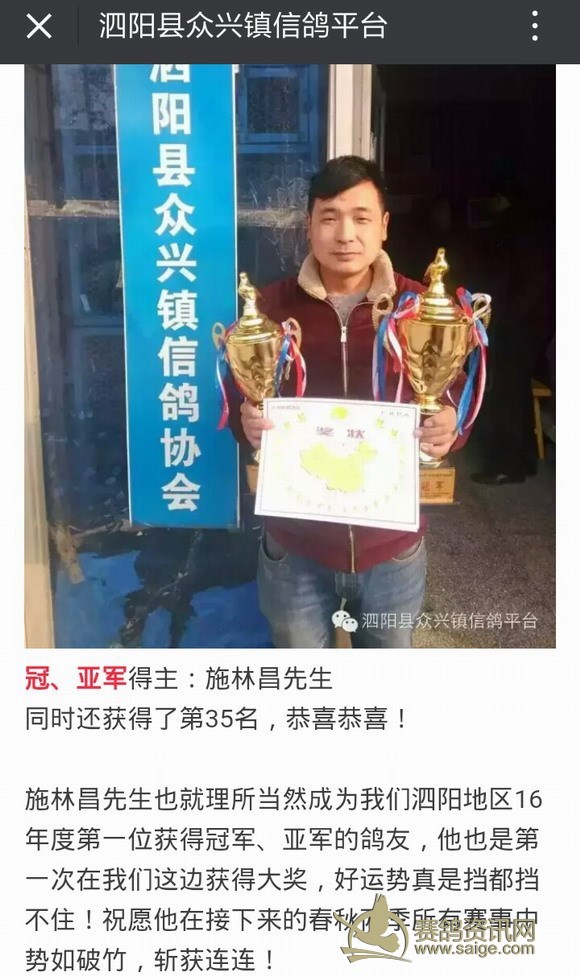 泗阳好鸽友,年度首冠军——施林昌