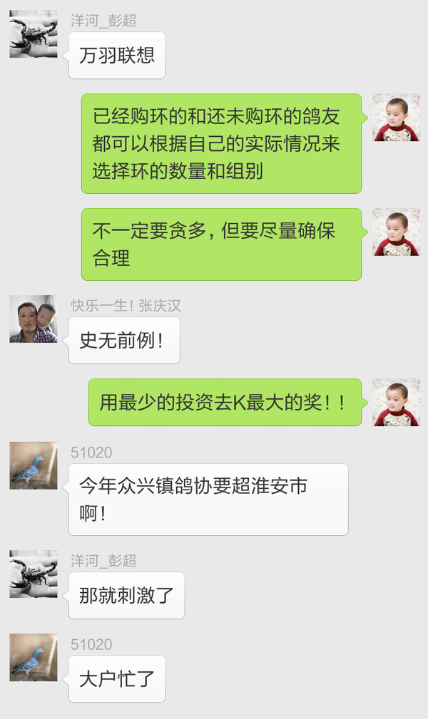 首先,在此我代表会长郑重地感谢大家的支持,正是因为有你们的大力支持我们众兴鸽协才得以在短短的两个多月时间内创造了一个小小的售环纪录——从2015.11.21下午开始到年前二月初在四组均没有保底的情况下算上替补环四组售环总数已突破4000枚,其中50元组更是突破了2000枚! 想想15年特比环我们总共才卖出了几百枚,而16年,也就是我们鸽会成立后的第二年即能够达到这样的销售数字,这真的带给了我们极大的惊喜与激励!而现在离5000枚大关仅有一步之遥,如果真的能够冲破5000这个大关,那可以说我们众兴鸽协真的创造了泗阳地区目前单独一家鸽会销售特比环数量的新记录,5000这个数字也会被人记住,更会成为日后同行们的一个超越目标!——另外与这个数字相伴而行的是我们这是现金售环,而且均是鸽友们完全自愿购买,没有任何一个人情环,甚至还允许退环! 我正式开始全面运作这个鸽会是从制订16年特比环章程开始的,而我一直致力于求新求变,为此我算是别出心裁地连续推出了三轮优惠促销活动,把向来严肃的特比环销售与之结合起来,而事实证明这三轮活动一经推出就在鸽友们中间引起了极大反响,更是获得了极好的效果,是个让人眼前一亮的双赢策略。 很多鸽友很好奇我们这边的售环情况,或者说有部分鸽友的购环习惯是看菜下单,而我记得早在年前第三轮优惠活动公告最后我就说过等第二批足环到家我会给大家介绍一下我们这边四组特比环的销售情况,年后我又在我们鸽会微信群里提到过,但至今迟迟没见动静,究其原因是因为我的心态在左右摇摆。一方面,我很兴奋地希望直接告诉大家四组的售环情况;另一方面,在兴奋之余我又觉得还是低调一点比较好,必竟那么多人看着呢。 而且更关键的一点是当售环总数突破4000时我一下想通了,我们的售环任务可以说已经提前完成了,从这个数字开始我们的售环将跨入一个全新的阶段,也将进入一个绝佳的状态——那就是它会如滚雪球一般自动地越滚越大,完全不必再作任何宣传,这个数字就是最好的宣传!它会像是获得了生命一般充分展现出一种自我发酵的能力,如细胞裂变一般,一生二,二生三,把真正想飞地方赛、想打好地方赛的鸽友极力吸引过来! 因为这个数字代表的是大羽数,而地方赛最大的含金量就是大羽数,同时大羽数也就意味着大奖金,这是成正比的——很少有鸽友能够拒绝得了这两样诱惑,尤其还是我们这个向来三公透明、距离到位、三奖及时有口皆碑的靠谱鸽会。 在此我也要感谢我们自己这一年半时间不随大溜坚持走自己的路——也正是因为这份坚持让鸽友们感受到了我们真心想办好一个鸽会的这份决心,于是我们收获了这份丰硕的回报!我想目前近5000枚特比环的销售数字就是对我们鸽会成立这一年半时间三个赛季总体表现的一次集中考核,我们到底做得怎么样,显然是合格的。 再次感谢大家行动上的认可和支持,让我们早早完成了售环任务,并和我们一起创造了一项史无前例的销售记录。 春赛已经启动,不断有鸽友直接来问我特比环的相关问题,我决定把有代表性的一些问题整理出来统一答复,顺便也将分组总结分析一下四组特比的销售情况。 下面是一些问题,如果有遗漏或者我没有提到的欢迎鸽友们直接指出。 1、 各组特比都还有没有环?会不会封顶? 答:我很奇怪从年前开始就不断有鸽友问我这组特比有没有环那组特比有没有环,可能还是我们第二批环到家后宣传的不够,现在统一答复一下,目前四前特比环数充足,不但特比环数充足,而且还同时卖普环,还请大家尽情购买!而且四组特比都不会封顶,一直卖到5、6月份罢市为止!反正鸽头数越多越热闹!很多鸽友都说16年秋季将是泗阳赛鸽史上前所未有的高峰,我们会用充足的环数来迎接这第一波高峰! 2、 特比环决赛是不是和沭阳联翔?鸽子是不是进我们自己的笼子? 答:肯定不是联翔!特比环决赛是我们鸽会自己的特比环决赛,鸽子当然进的是我们自己的笼子!到时候会在我们鸽会门口统一集鸽上笼,沭阳和淮阴地区购买了我们特比环的鸽友会和大家一样把鸽子送到我们鸽会门口统一扫描上笼,这个还请大家放心! 我知道大家关心的是羽数问题,我们泗阳集的鸽子再多到了沭阳跟前都会是小羽数,而小羽数比较容易丢鸽子,为此我和会长基本上决定放弃了秋赛300公里和沭阳联翔的事。我们之前想在秋赛300公里那一站和沭阳兄弟鸽会来一场万羽大联翔的,今年我们特比卖了那么多,300公里那一站肯定能集到几千羽,再加上沭阳那边兄弟鸽会特比卖得比我们还多,两家联翔总羽数一定会超过万羽,而万羽大联翔的冠军会是多么的吸引人!但想想我们今年秋赛是难度系数最高的三关赛,而300公里还不是第一关,为了尽量确保大家不丢鸽子少丢鸽子,把鸽子留到最后一关特比总决赛,我们还是决定放弃万羽大联翔,等我们泗阳鸽子的整体水准和羽数都提高了再去联翔也不迟——毕竟我们今年最重要的任务是把特比决赛也就是三关赛飞好搞成功! 3、 替补环是不是更有利于大户? 答:不会!因为年前二月初突破4000枚大关时还没有任何一个所谓的大户来拿我们这边的环,可见我们这边真的是最广大普通鸽友撑起来的鸽会,这也与我们鸽会成立的初衷相一致——我们本来就是为最广大普通鸽友服务的鸽会,代表的也是最广大普通鸽友们的利益和心声。我觉