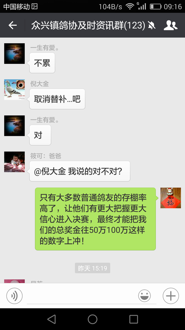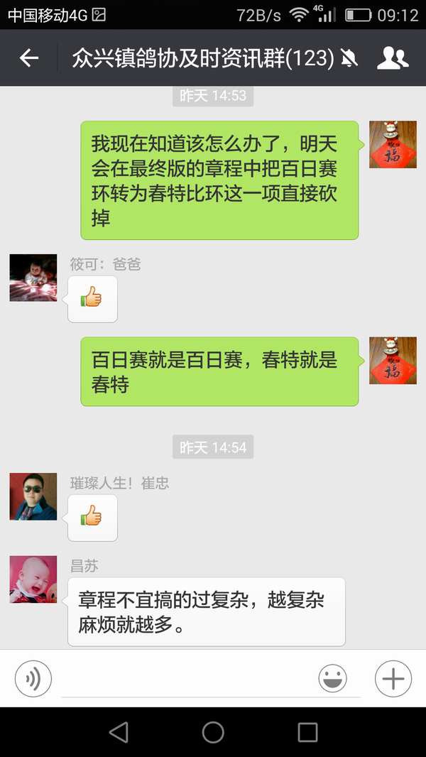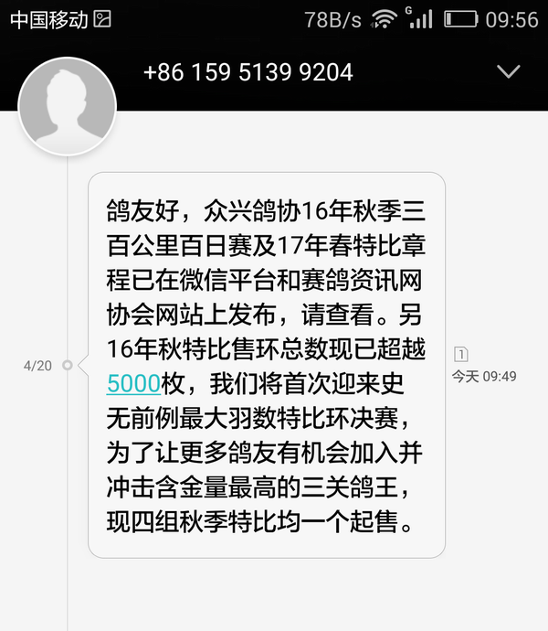 (一)2016年秋季三百公里百日赛章程 一、时间 2016年秋季第一场300公里商丘站决赛(10月上旬,视天气而定) 二、售环 100元一枚,5个起售 2016年5月1日正式售环 赠送相同数量替补环,配备副环 收取正环钱,3元一枚,购环时交清。替补环免费。 三、录取名次及奖金分配 全额设奖,按“十取一”录取名次,不设团体奖 前三名发精美奖杯一座 (二)2017年春季特比环章程 一、时间 2017年春季鸽会自己组织500公里郑州北服务区决赛(4月下旬,视天气而定) 二、售环 分50和200元两组,2016年5月1日正式售环。 50元组:10个为一个团体(5个起售),赠送相同数量替补环,配备副环 200元组:10个为一个团体(10个起售),不赠送替补环,配备副环 两组均收取正环钱,3元一枚,购环时交清。50元组替补环免费。 三、录取名次及奖金分配 两组均全额设奖,互不兼得 两组均按“十取一”录取名次,两组团体均取前三名 前三名和团体前三名各发精美奖杯一座。 本章程最终解释权归众兴鸽协所有。未尽事宜,另行通知。 泗阳县众兴镇信鸽协会 2016-04-20