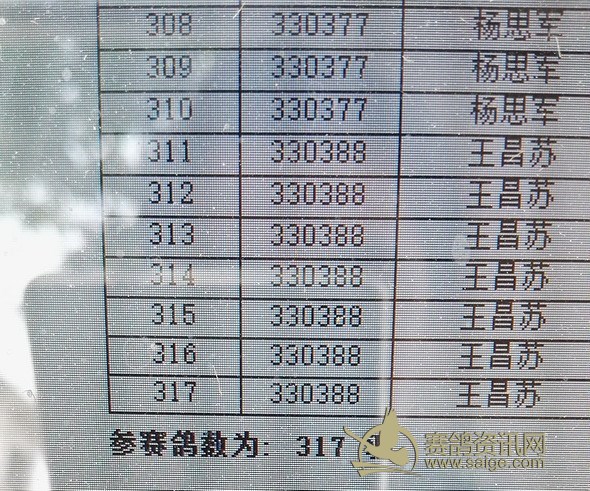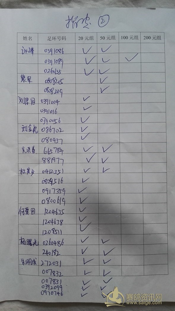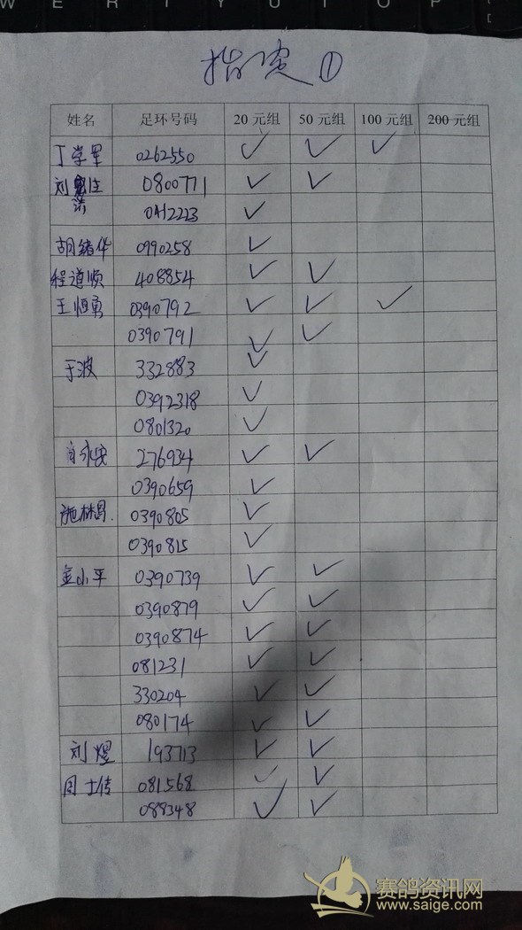 本站共集鸽317羽,感谢鸽友们的支持,预祝各位明天飞出佳绩! 本站各组指定: 20元组:62羽,十取一,取前7名; 50元组:32羽,十取一,取前4名; 100元组:3羽,一把抓。 特别再提一下:不知道大家是否都还记得今年元旦杯开封站之后我在微信平台发过一篇说明,说集鸽完毕后如果有鸽友想追加指定的可以及时追加,因为大家都知道一个情况那就是金额大一点的指定鸽友们都喜欢一个看一个,而大家来交鸽的时间又不一样,所以往往看到最后的结果是都没指成。 现在统一这样子:集鸽完毕后我会第一时间把指定名单(初版)发到微信群里,鸽友们看了之后如果发现哪组有人指了自己想追加可以及时联系我;如果有鸽友看到另外某位鸽友的鸽子很不错想自己指定也可以及时联系我。只要把指定钱及时补交到位,我在指定名单上标注清楚就行。 我不知道这样的规定在别的鸽会行不行,反正在我们这边行,我们不拘泥于形式,尽量在规则之内做的人性化一些。毕竟每一场集鸽完毕就意味着少了一场比赛,而比赛的机会终究有限,错过任何一场让鸽子冒头也让自己冒头的机会都可惜。 就像这场集鸽完毕后许峰看到100元组只有丁学军一个人指之后立即打电话来追加了一羽形成PK战,不至于使这一组直接作废,后来王恒勇看到有两人指定也立即加入最终变成三个人决战;刘祥看到朱明成老师的两羽指定鸽之后立即以朱明成老师的名义各追加了一组50元的;陈业军在20元组追加了多羽杨思军的鸽子。 我觉得这是一件好事,但有时间限制,那就是我在微信平台和协会网站公布最终各组指定名单之前。