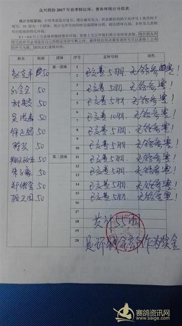50元组共计售环486枚,奖金共计24300元,奖金分配稍后公布。 售环名单公示两日,请购环鸽友确认自己的环号是否正确,如有误及时提出; 公示结束如再有误而影响最终成绩,本鸽会概不负责。