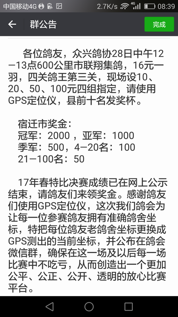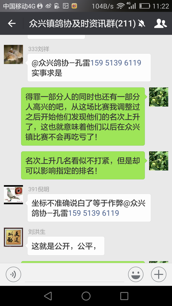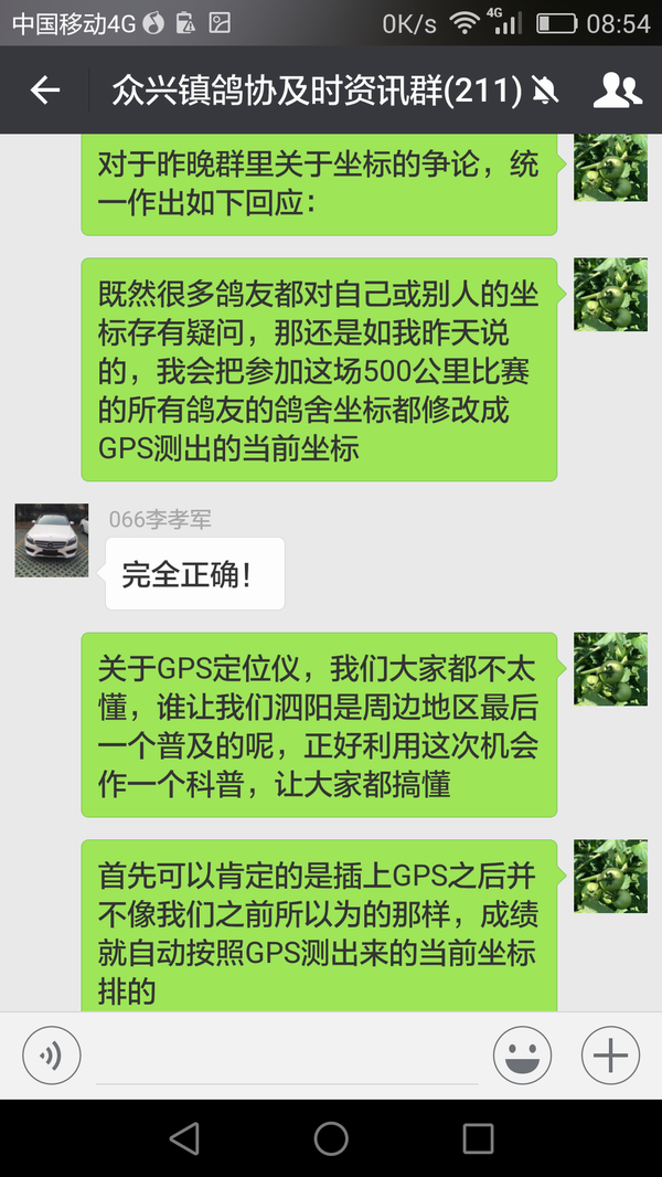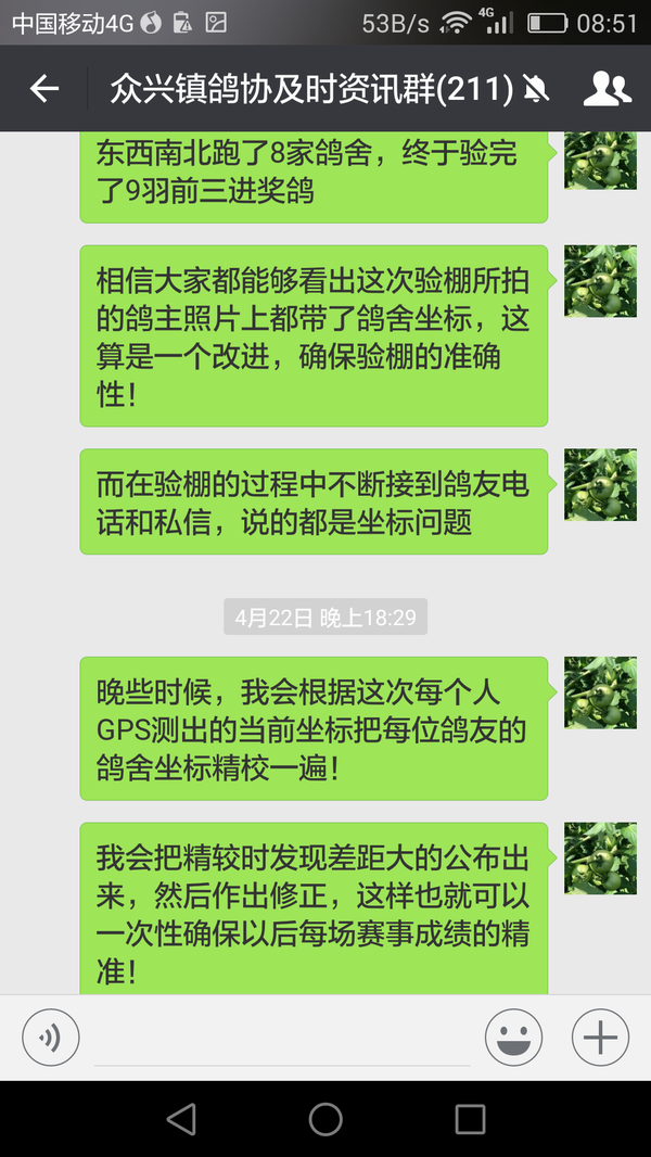 今年春赛我们正式推广GPS定位仪,绝大部分鸽友均已用上,这次郑州站决赛我验鸽时更是把获奖鸽友的坐标也拍在了照片上,就是为了强调坐标的准确性! 群里鸽友对于坐标是否准确也一直争论不休,为此我于23号花了大半天时间把所有参赛鸽友的老鸽舍坐标均更换成了GPS定位仪测出的当前坐标,并截图发在微信群里让每一位参赛鸽友确认自己的空距差,从而彻底排除了参赛鸽友的坐标不准问题,也为以后的每一场比赛在公平公开公正性上奠定了基础! 我的这一举动在鸽友们中间引发了很大的反响,在我们群里更是进行了几次集中讨论,由此可以看出不管怎么样,也不管什么类型的鸽友最终心底呼唤的是在一个绝对【三公、透明、规范】的平台上进行比赛,而我们鸽会在努力做的就是尽可能把自己打造成三公透明的规范平台!
