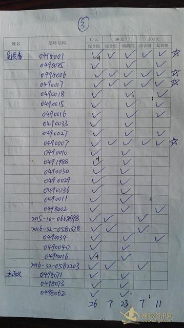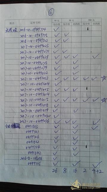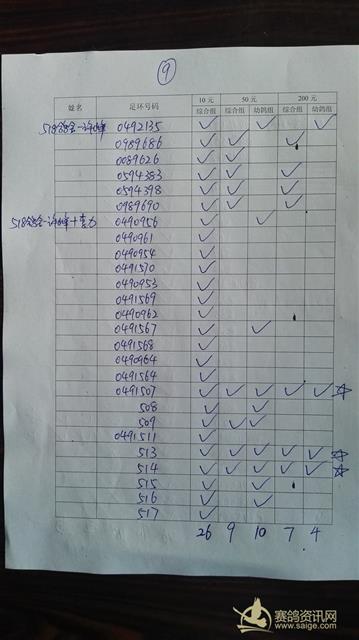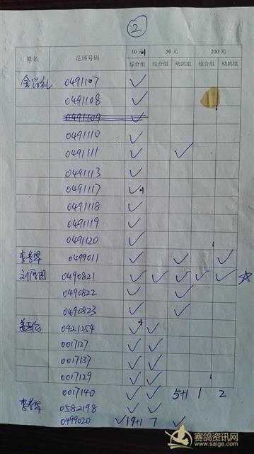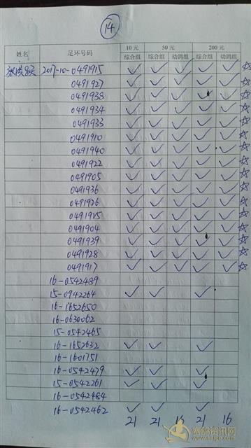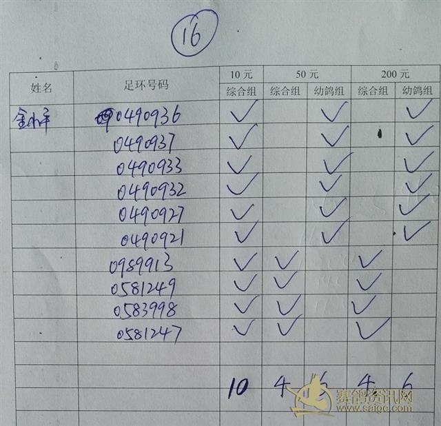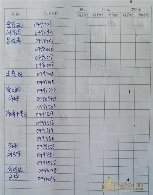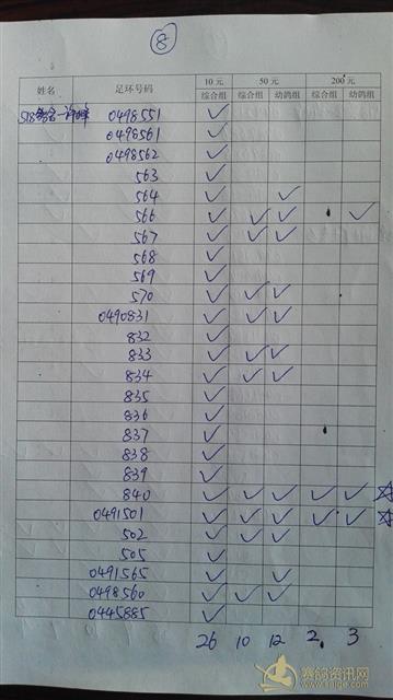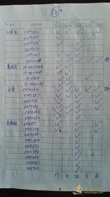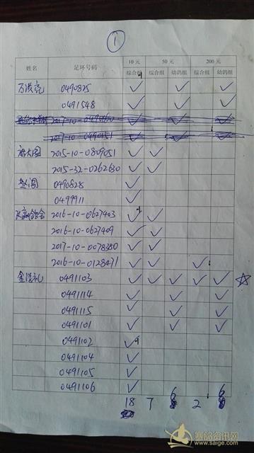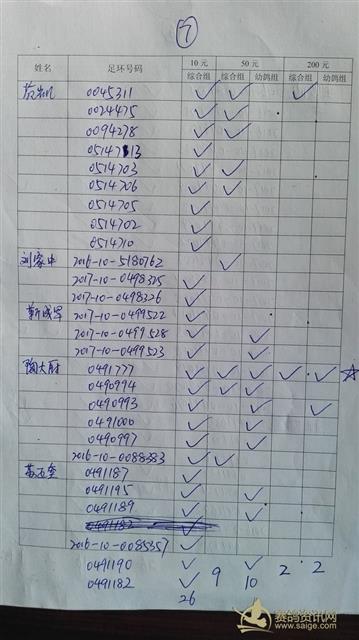 特别声明 本次暗指几乎所有鸽友均采用拍照或微信留言后由我代抄的方式报名,因此从即日起至17日晚24点为公示时间,在此公示期间请每一位参加的鸽友务必认真核对自己的每一个环号是否准确无误。如果确是我抄写错误,我会在鸽会微信群公开证明后为之更改。 公示期结束后如果还因环号等其它任何问题而影响最终决赛站的成绩排名,本人及本鸽会将不负任何责任。 特此公告。 暗指报名已于14号晚24点准时截止,本次打破了以往暗指必然大的惯例得到了很多鸽友的积极响应,最终总奖金达到了51960元(全额设奖)! 感谢鸽友们的热情参与,给我们整个秋赛奖项的设置开了一个好头! 各组指定羽数及奖金分配如下: 10元综合组,356羽,奖金3560元,一把抓; 50元综合组,132羽,奖金6600元,取三名 第一名3300元,第二名1980元,第三名1320元。 50元幼鸽组,200羽,奖金10000元,取五名 第一名3000元,第二名2500元,第三名2000元 第四名1500元,第五名1000元。 200元综合组,70羽,奖金14000元,取三名 第一名7000元,第二名4200元,第三名2800元 200元幼鸽组,89羽,奖金17800元,取五名 第一名5340元,第二名4450元,第三名3560元 第四名2670元,第五名1780元。 我个人最为满意的是10元组,小于360羽就是一把抓,而现在的这个数字在一把抓的范围内已经无限接近于最大值了!也就是说有一位鸽友将用10元钱K到3560元,整整翻了356倍,这么惊人的回报率将使本身毫不起眼的10元组摇身一变成为决赛站一个极大的关注点!不知这位幸运儿会是谁!
