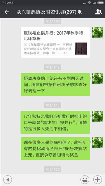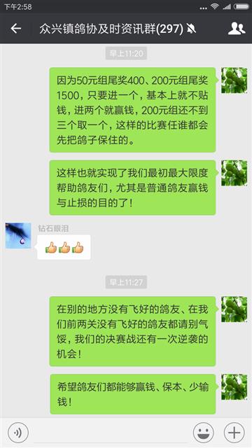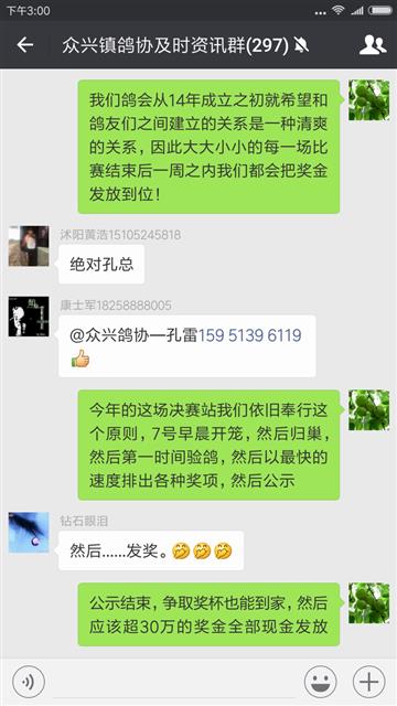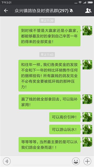 请获奖鸽友核对自己的奖金金额,明天早晨(11号)8:30准时来鸽会领取奖金,42万总奖金一次性现金发放! 奖杯先不等了,如果又发奖金,又发奖杯,再拍照,明天发奖现场一定会很忙很乱,容易出错,而这次奖金钱又不算少,所以还是一样一样来吧,先发钱——让大家最快速度领到奖金最重要! 昨天晚上把奖金清单发到群里后很多鸽友私信我很惊讶我们这边能有42万的总奖金!老实说我昨天上午算出后比谁都惊讶!奖金本来就不是我们这边今年的亮点,可以说在去年售环初期,没有谁对我们这边抱什么期望,甚至有很多人直言我们这边会倒闭,但我们就是一路沉默着走过来了!虽然今年售出的环不算多,但从秋赛启动开始,每一场训放和比赛的集鸽羽数都很高,远远超出我们的预期,所以说还是做好自己的事最要紧!虽然42万和别人家的百十万不能比,但我们就能保证你在几天之内领到现钱,享受百分百的赢钱的快感! 今年我们主打的是尾奖,从清单上看不论是50元组还是200元组,只要进奖的,哪怕就是尾奖,也基本上不亏什么钱,这就是为广大普通鸽友考虑的奖金分配方案,没比赛之前鸽友们可能没什么感觉,但现在比赛结束分奖金了鸽友们才切实感受到这种奖金方案带来的实惠! 每一年决赛之后都有人笑有人哭,都会有人选择离开,而我们尊重每个人的选择,看淡每个人的离开,因为总会有新的人加入进来。 感谢今年秋天参加众兴镇比赛的每一位鸽友,也欢迎你们明年继续来比赛!