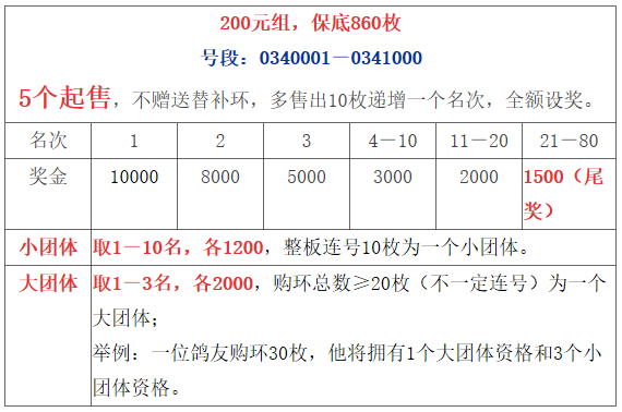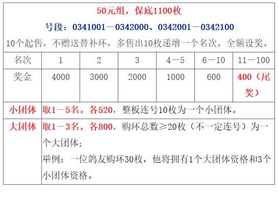 今年两组特比除了保留去年的超高尾奖金额之外,另一大特色就是大小团体的设置,其中200元组共设了10个小团体,还请鸽友们留心!而想参加我们汽车大奖赛及万元组的争夺需从购买我们的两组特比开始,也请鸽友们留心!