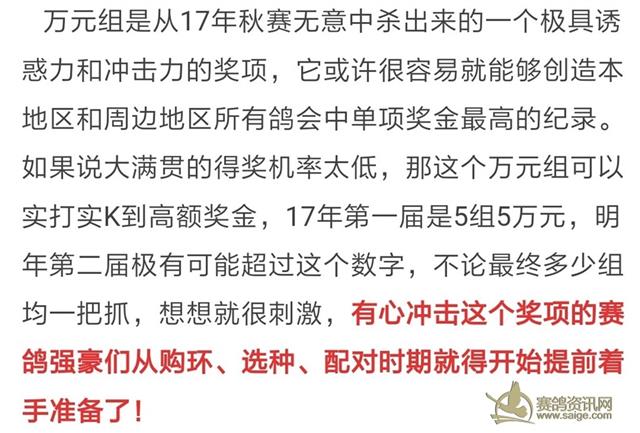 年前年后,正式进入配对育雏期。 由于今年秋赛特比环将是三关鸽王赛制,近期有一些鸽友不断来询问暗指、万元组这些附属奖项是不是也是按照三关赛来录取名次。 考虑到今年秋赛各组暗指奖项丰富,在此我们鸽会作出统一答复,并把各组暗指赛制规则提前确定公布出来,以便鸽友们从育雏套环期就提前着手准备。 今年秋赛暗指将从10元到10000元由小到大分为六组,六组将全部和特比环一起按照三关总分速来录取获奖名次,因为按照三关赛制确定最终名次才最没有争议,最有可能排除一场风向定输赢的局面;其次特比环幼鸽理应飞三关完成自身的特比环奖项争夺,之余再完成暗指这些附属奖项的争夺,顺序也应该是这样。 六组暗指赛制规则如下,具体详细规程将在7月初正式公布: A组:万元组 参赛资格:众兴鸽协18年秋季50、200元组特比幼鸽 作为在暗指中首创“万元组”的鸽会,此奖项将作为我们鸽会每年的保留曲目加以推广。据我目前得到的反馈已经有六七位鸽友兴冲冲地决定要参加了,其中有人准备上3到4组!可能谁都没有想到去年首届万元组是由209名的鸽子K走的,估计今年参加组数应该轻松超越去年的5组!如果说去年有些鸽友没有好好准备的话,今年有心冲击这个奖项的鸽友就要从现在开始好好准备了!