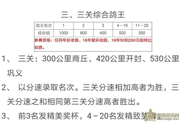 今年我们不光为特比幼鸽准备了三关鸽王赛,同时还为普环、老鸽准备了综合组的三关鸽王赛,含金量更高,还请鸽友们留心了!