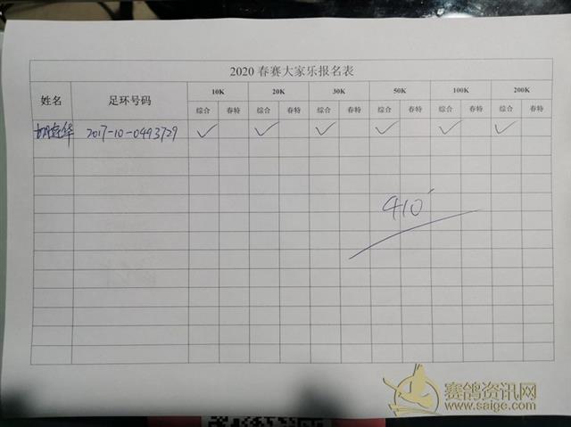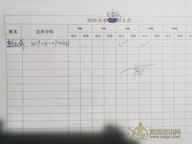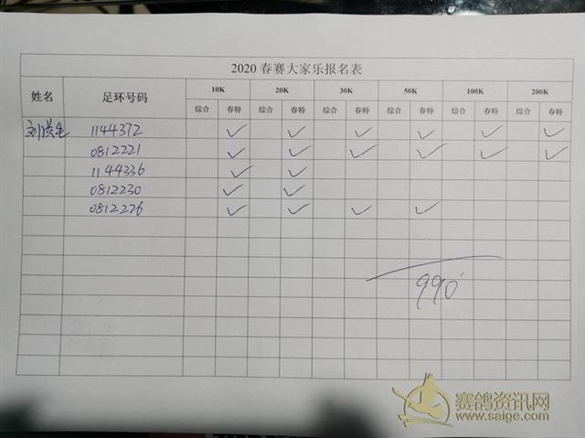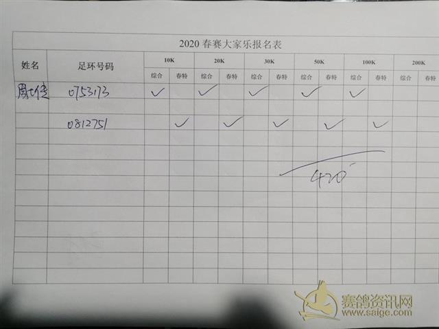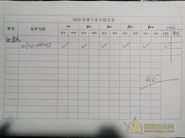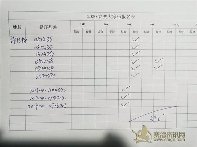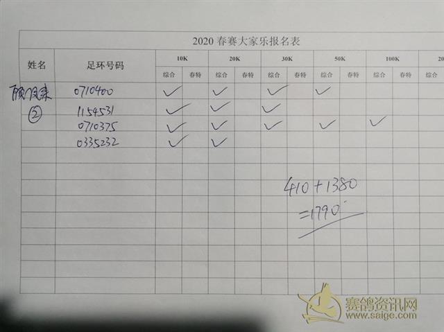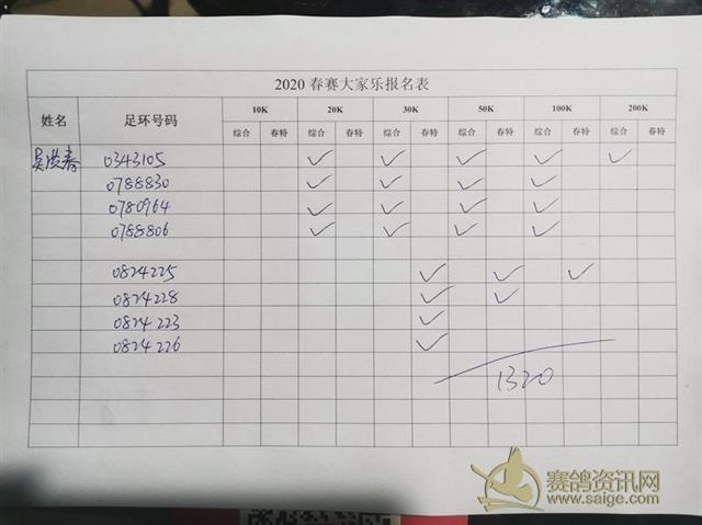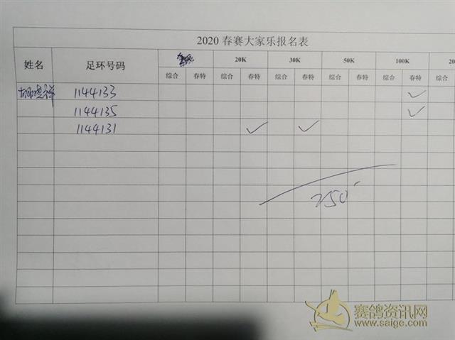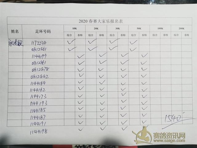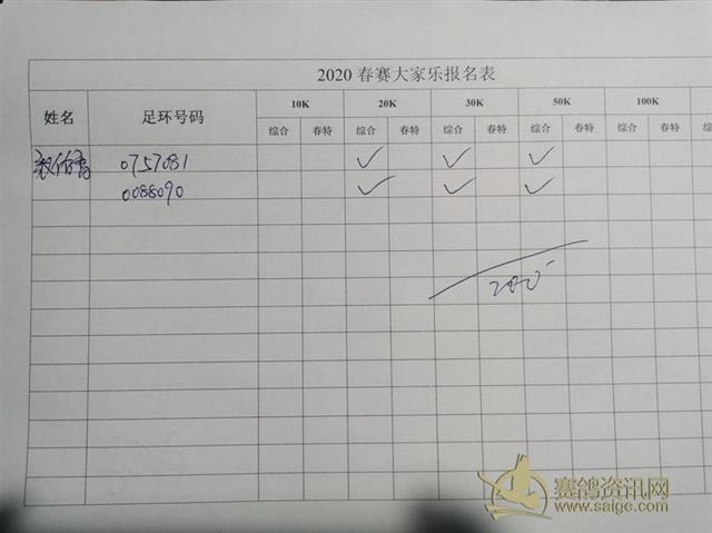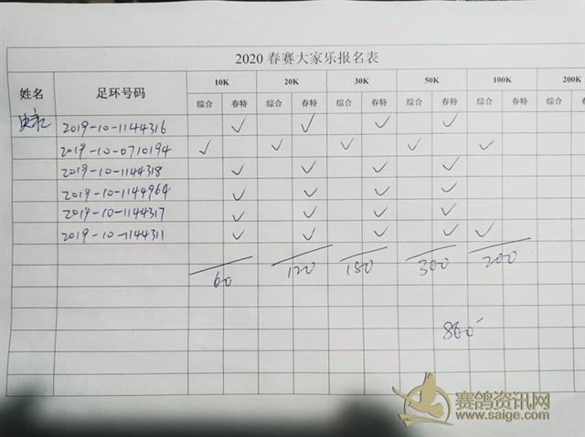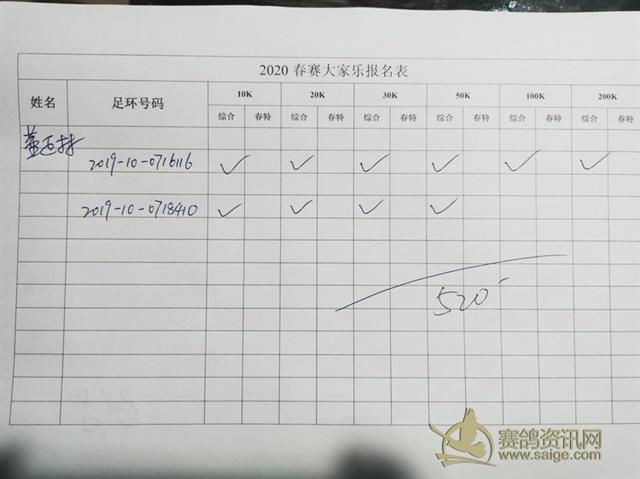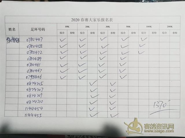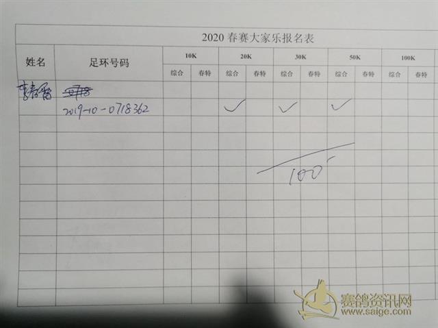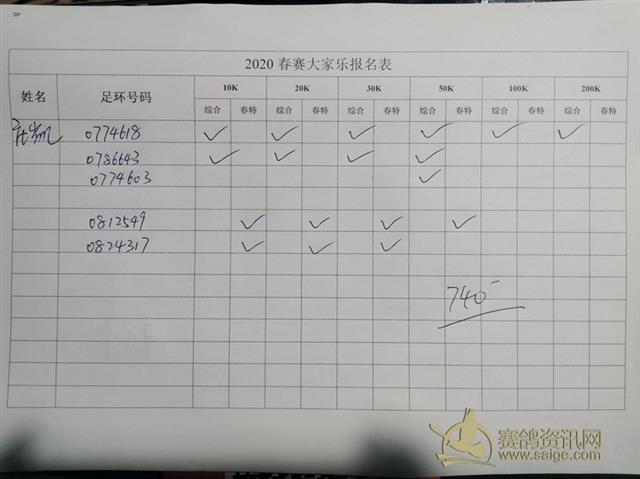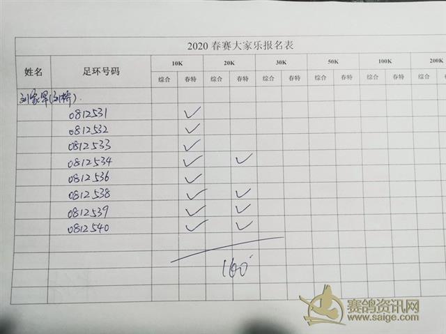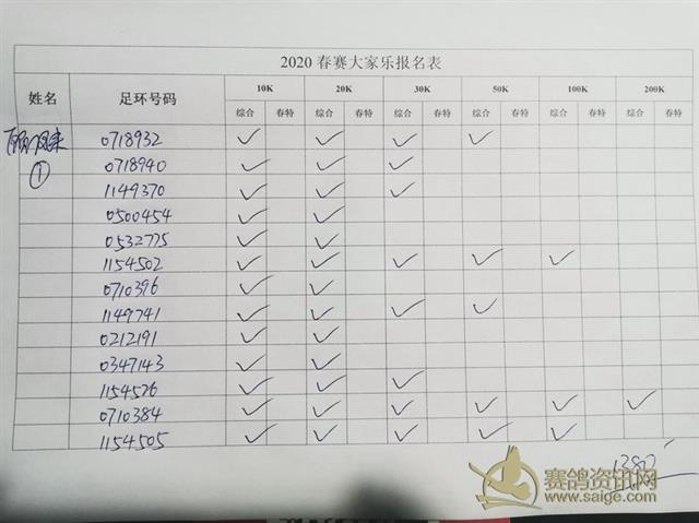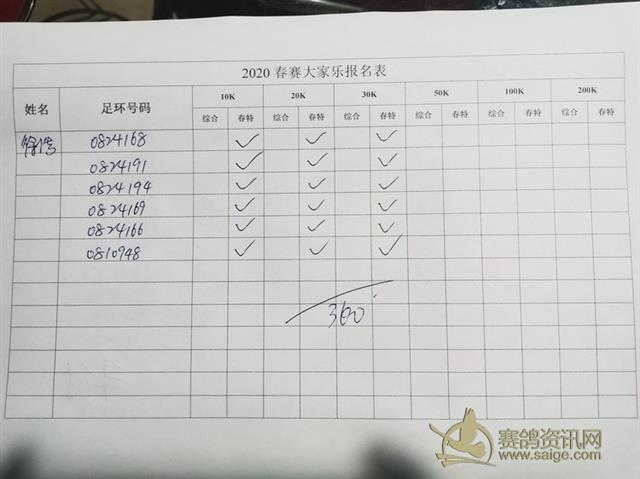 特别声明 本次大家乐鸽友们依旧采用微信留言由我代抄的方式报名,因此今天(7号)公示一天,在此公示期间请每一位参加的鸽友务必认真核对自己的每一个环号和指定组别打钩是否准确无误。如果确是我抄写错误,我会在鸽会微信群公开证明后为之更改。 公示期结束后如果还因环号等其它任何问题而影响最终成绩排名,本人及本鸽会将不负任何责任。 特此公告。 各组均在最后一场500公里春特比决赛站前200名内均分奖金。 10K综合组:36羽,324 10K幼鸽组:40羽,360 20K综合组:43羽,774 20K幼鸽组:43羽,774 30K综合组:41羽,1107 30K幼鸽组:47羽,1269 50K综合组:35羽,1575 50K幼鸽组:27羽,1215 100K综合组:20羽,1800 100K幼鸽组:7羽,630 200K综合组:8羽,1440 200K幼鸽组:3羽,540