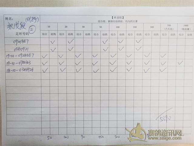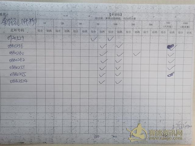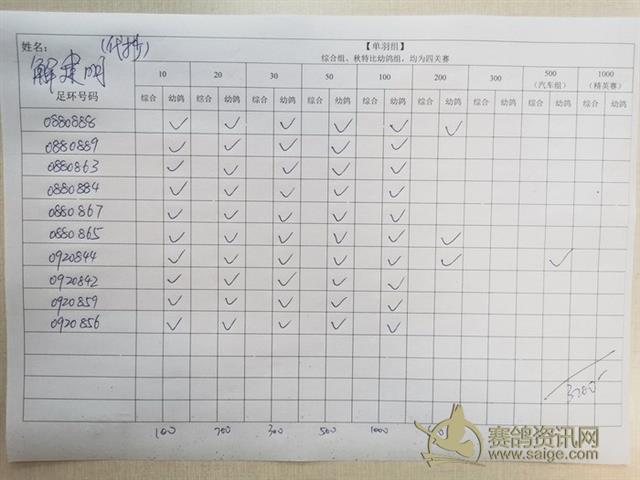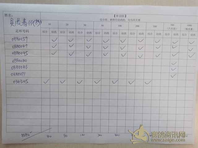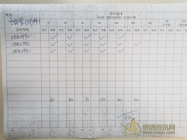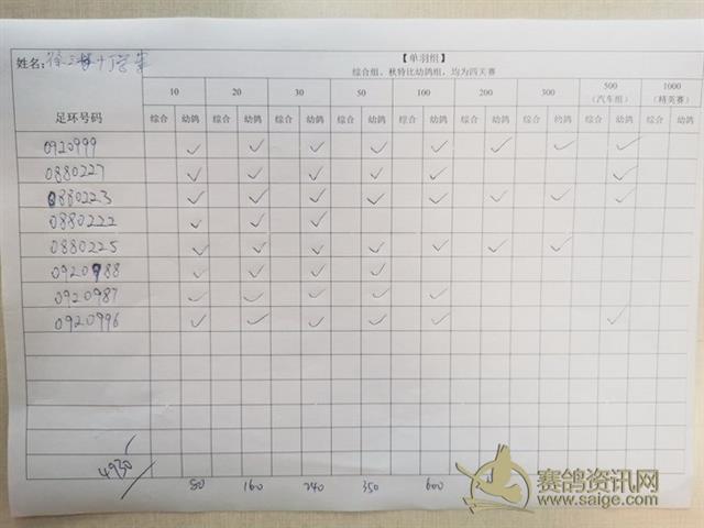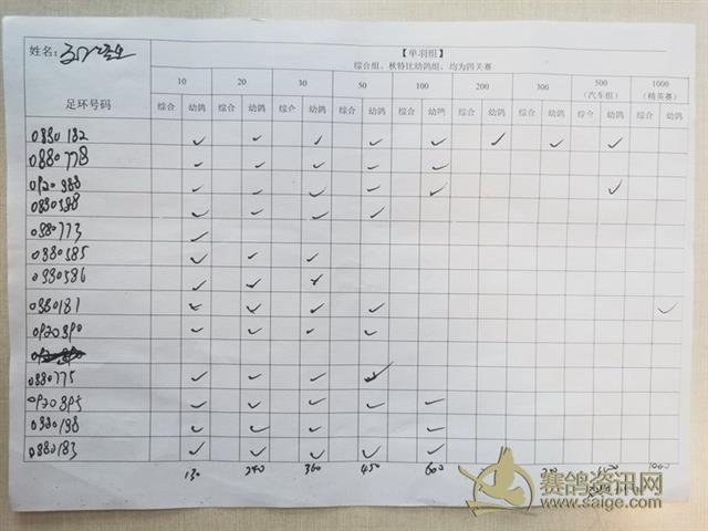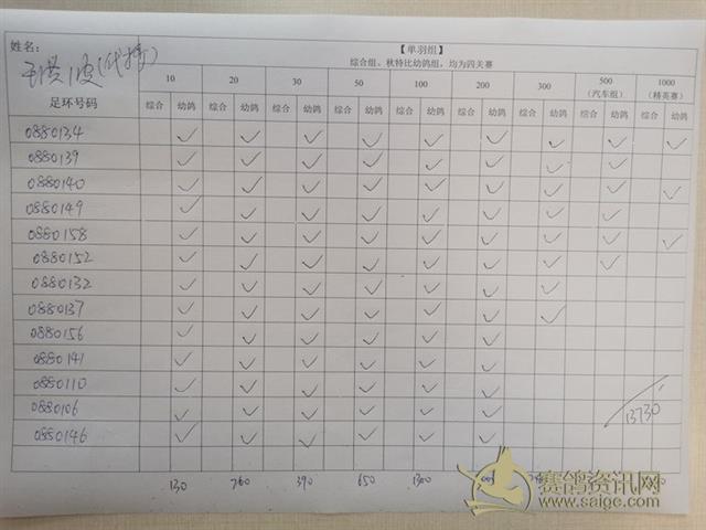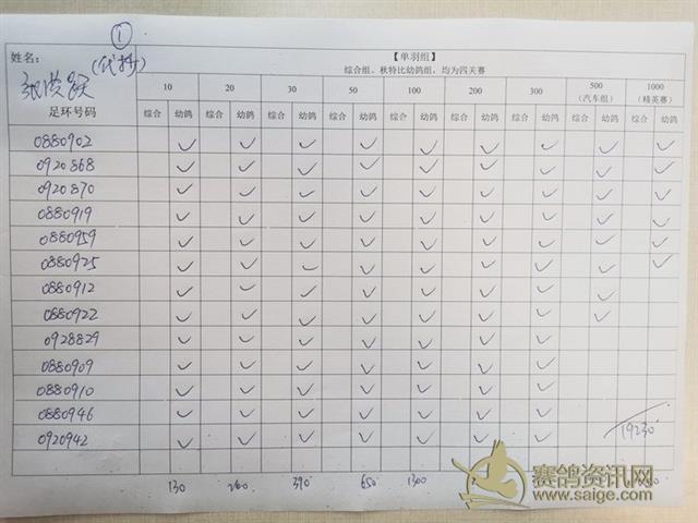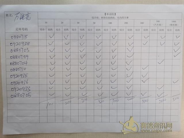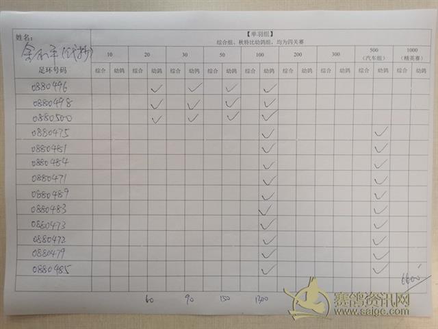 10综合:9羽 第1名:45 第2名:36 10幼鸽:96羽 第1名:288 第2名:240 第3名:192 第4名:96 第5名:48 20综合:9羽 第1名:90 第2名:72 20幼鸽:118羽 第1名:708 第2名:590 第3名:472 第4名:236 第5名:118 30综合:9羽 第1名:135 第2名:108 30幼鸽:116羽 第1名:1044 第2名:870 第3名:696 第4名:348 第5名:174 50综合:10羽 第1名:250 第2名:200 50幼鸽:124羽 第1名:1860 第2名:1550 第3名:1240 第4名:620 第5名:310 100综合:10羽 第1名:500 第2名:400 100幼鸽:118羽 第1名:3540 第2名:2950 第3名:2360 第4名:1180 第5名:590 200综合:8羽 第1名:800 第2名:640 200幼鸽:71羽 第1名:4260 第2名:3550 第3名:2840 第4名:1420 第5名:710 300综合:8羽 第1名:1200 第2名:960 300幼鸽:50羽 第1名:4500 第2名:3750 第3名:3000 第4名:1500 第5名:750 500综合:5羽 第1名:2250 500幼鸽:62羽 第1名:27900 1000综合:3羽 第1名:2700 1000幼鸽:31羽 第1名:27900