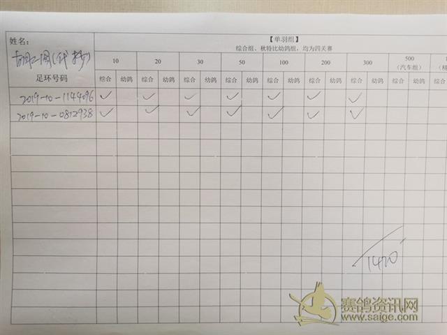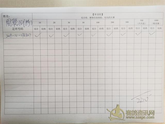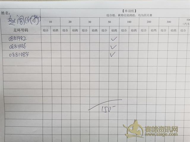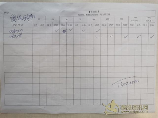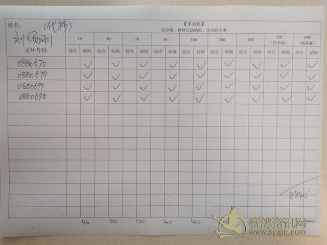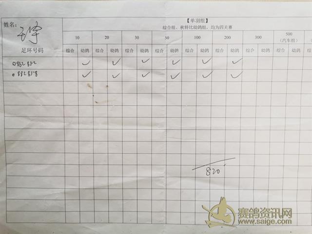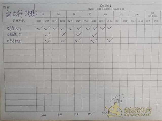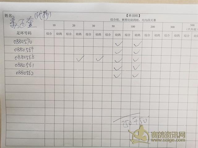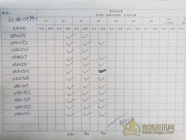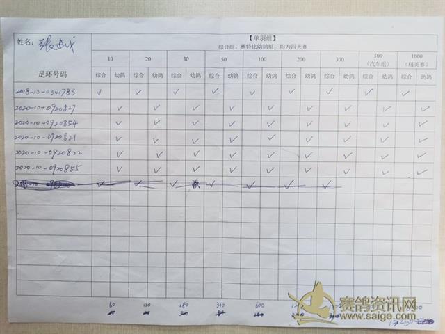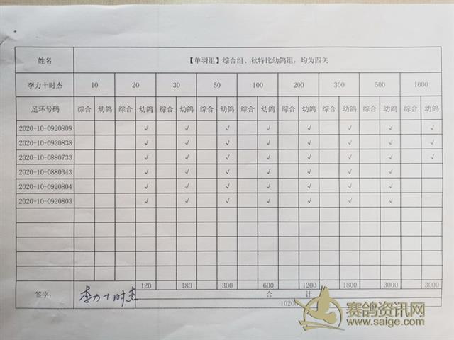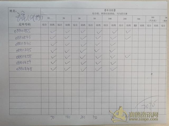 10综合:9羽 第1名:45 第2名:36 10幼鸽:96羽 第1名:288 第2名:240 第3名:192 第4名:96 第5名:48 20综合:9羽 第1名:90 第2名:72 20幼鸽:118羽 第1名:708 第2名:590 第3名:472 第4名:236 第5名:118 30综合:9羽 第1名:135 第2名:108 30幼鸽:116羽 第1名:1044 第2名:870 第3名:696 第4名:348 第5名:174 50综合:10羽 第1名:250 第2名:200 50幼鸽:124羽 第1名:1860 第2名:1550 第3名:1240 第4名:620 第5名:310 100综合:10羽 第1名:500 第2名:400 100幼鸽:118羽 第1名:3540 第2名:2950 第3名:2360 第4名:1180 第5名:590 200综合:8羽 第1名:800 第2名:640 200幼鸽:71羽 第1名:4260 第2名:3550 第3名:2840 第4名:1420 第5名:710 300综合:8羽 第1名:1200 第2名:960 300幼鸽:50羽 第1名:4500 第2名:3750 第3名:3000 第4名:1500 第5名:750 500综合:5羽 第1名:2250 500幼鸽:62羽 第1名:27900 1000综合:3羽 第1名:2700 1000幼鸽:31羽 第1名:27900