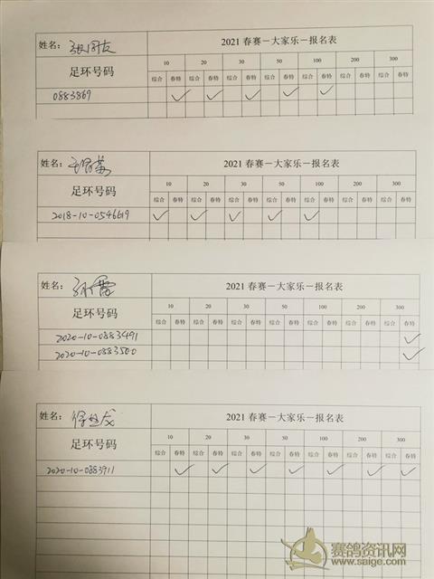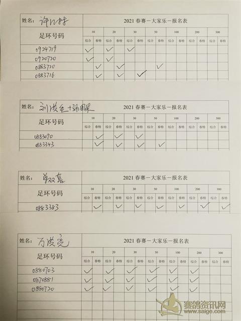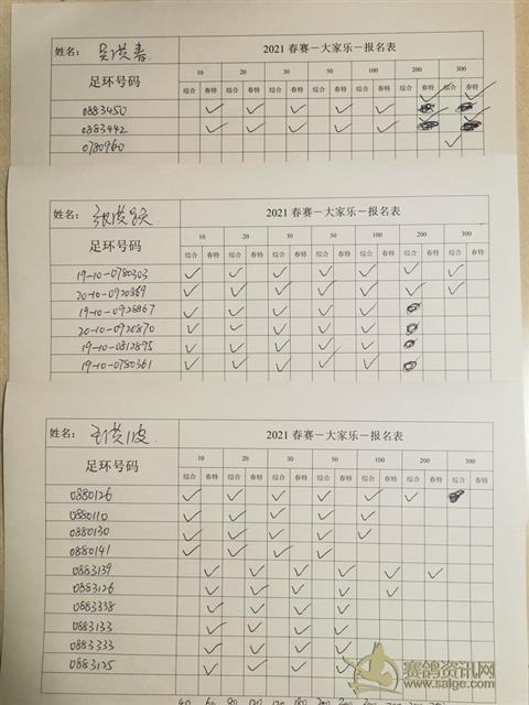 特别声明 本次大家乐鸽友们依旧采用微信留言由我代抄的方式报名,因此17号公示一天,在此公示期间请每一位报名的鸽友务必认真核对自己的每一个环号和指定组别打钩是否准确无误。如果确是我抄写错误,我会在鸽会微信群公开证明后为之更改。 公示期结束后如果还因环号等其它任何问题而影响最终成绩排名,本人及本鸽会将不负任何责任。 特此公告。 各组均在最后一场530公里春特比决赛站综合总排名前150名内均分奖金。如果前150名内没有获奖鸽,则向后顺延由最接近于150名的报名鸽独揽该组的所有奖金。 10K综合组:21羽,189 10K幼鸽组:18羽,162 20K综合组:25羽,450 20K幼鸽组:22羽,396 30K综合组:25羽,675 30K幼鸽组:21羽,567 50K综合组:17羽,765 50K幼鸽组:17羽,765 100K综合组:14羽,1260 100K幼鸽组:11羽,990 200K综合组:6羽,1080 200K幼鸽组:6羽,1080 300K综合组:3羽,810 300K幼鸽组:8羽,2160