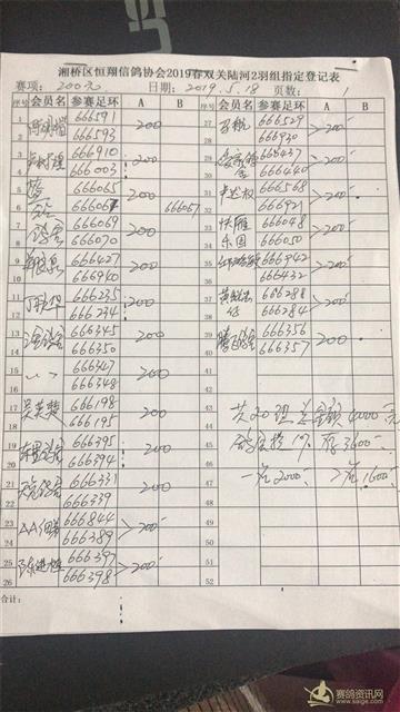 潮州市湘桥区恒翔信鸽协会 2019年春季双关陆河2羽组指定登记表 总20组总金额4000元,鸽会提10%,存3600元,一名2000元,二名1600元