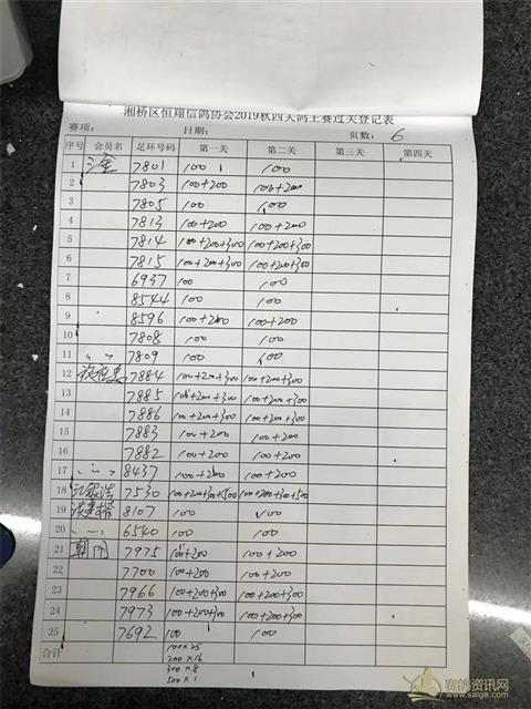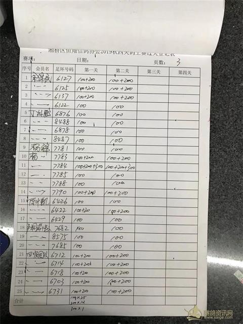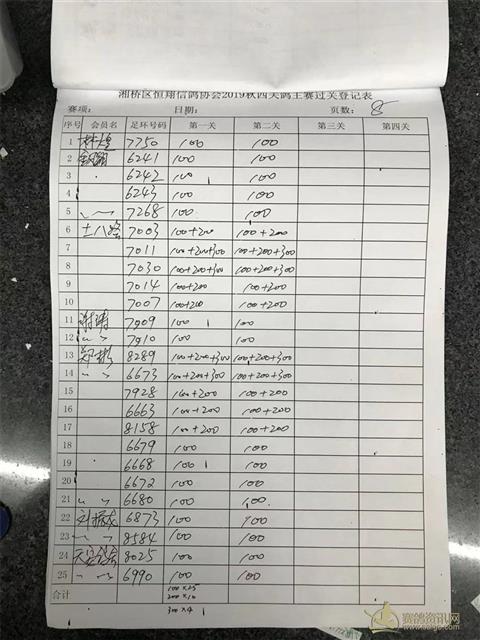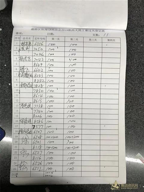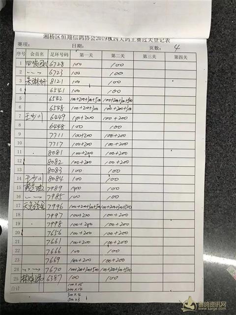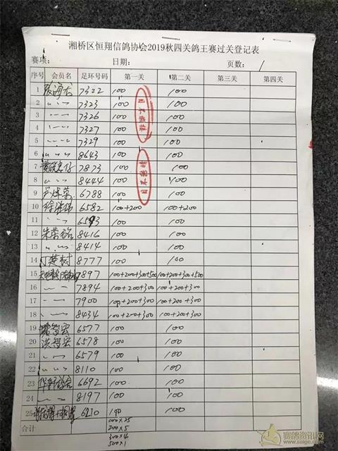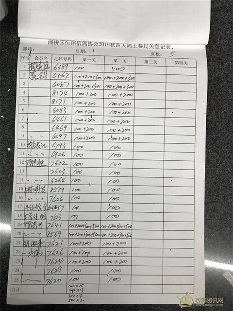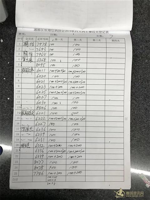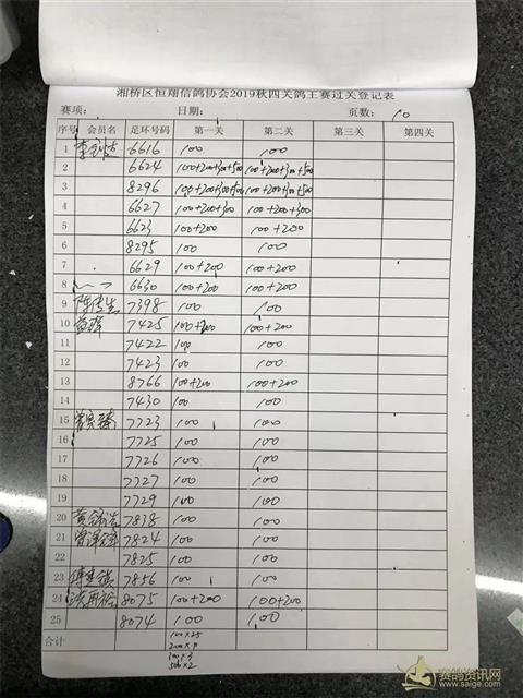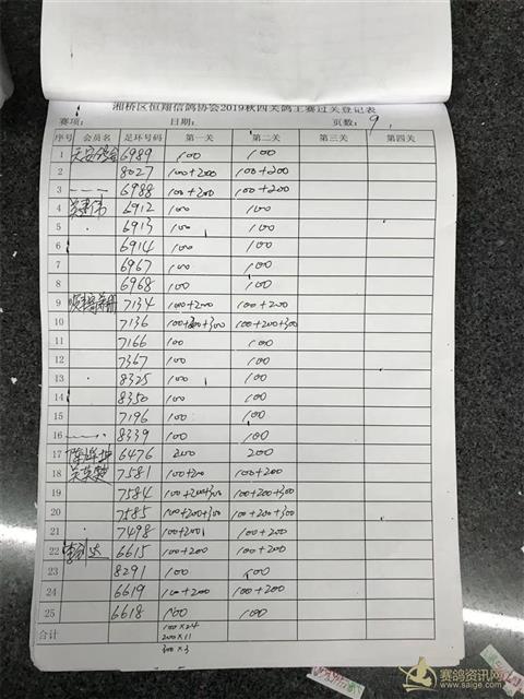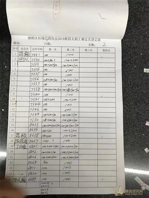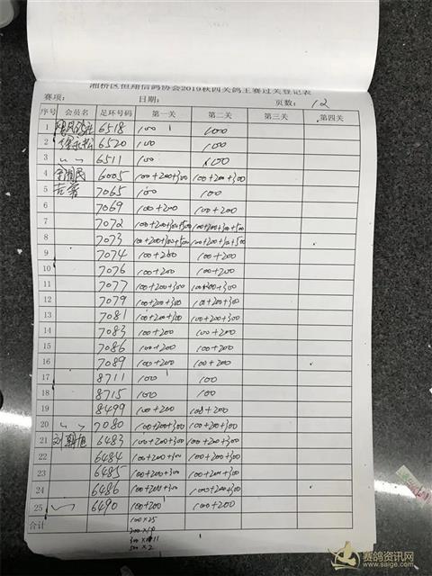 湘桥区恒翔信鸽协会2019年秋四关鸽王赛二关过关登记表