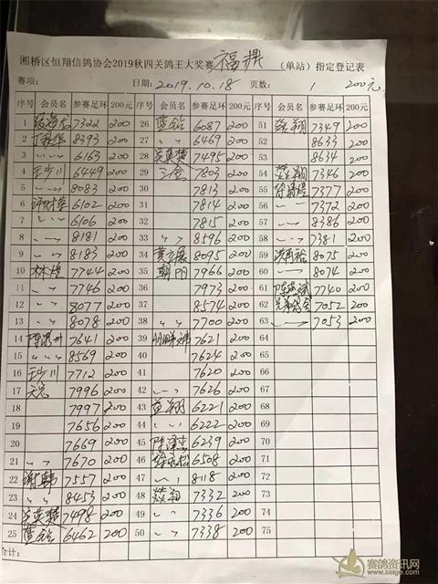 湘桥区恒翔信鸽协会2019年秋四关鸽王大赛福鼎单站指定登记表