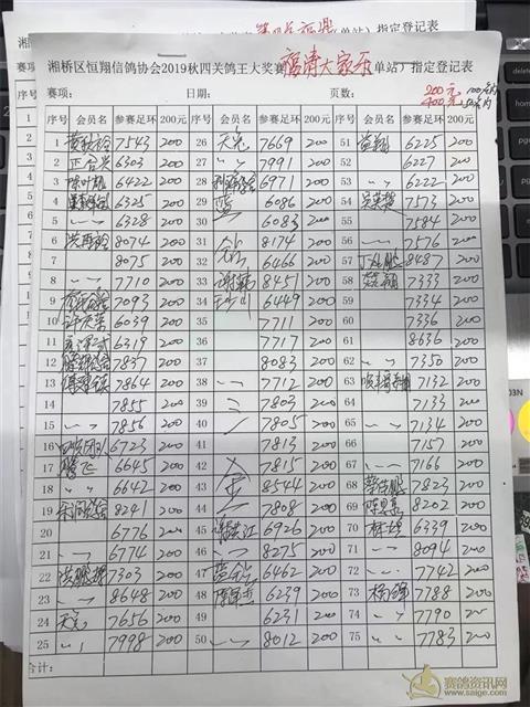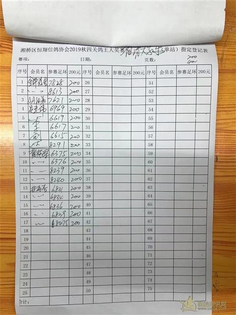2019年秋四关鸽王大奖赛福清大家乐200元指定登记表