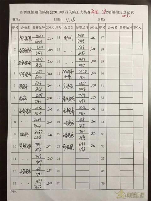 2019年秋四关鸽王大奖赛第三关平阳站2羽组指定表