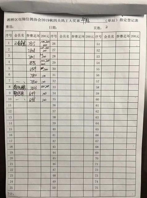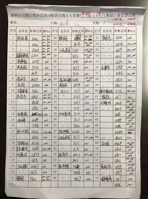 2019年秋四关鸽王大奖赛第三关平阳站指定100、200、300、500元组登记表