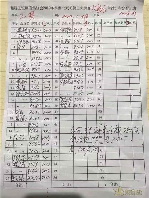 2019年冬季西北双关鸽王大奖赛第四站三明大家乐指定登记表