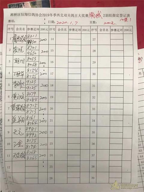 2019年冬季西北双关鸽王大奖赛第一关南城2羽组指定登记表