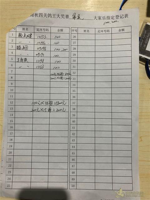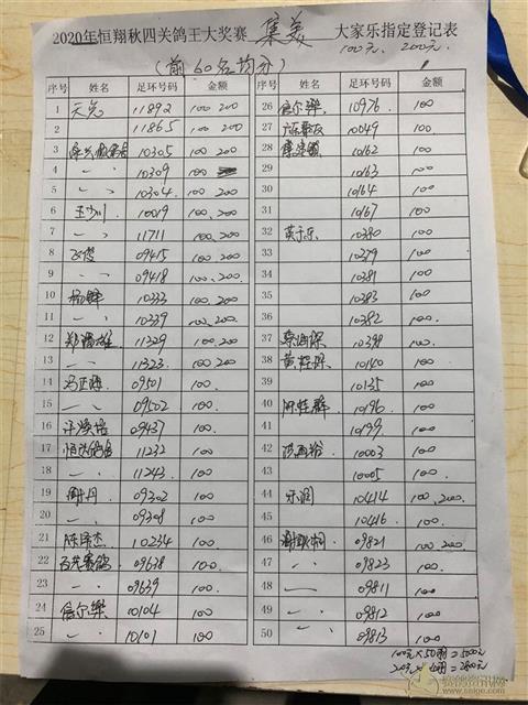 2020年恒翔秋四关鸽王大奖赛第三站集美站大家乐指定登记表