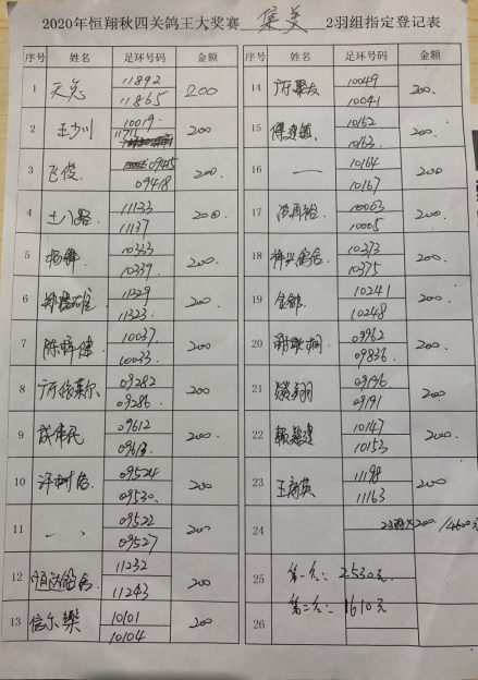 2020年恒翔秋四关鸽王大奖赛第三站集美2羽组指定登记表