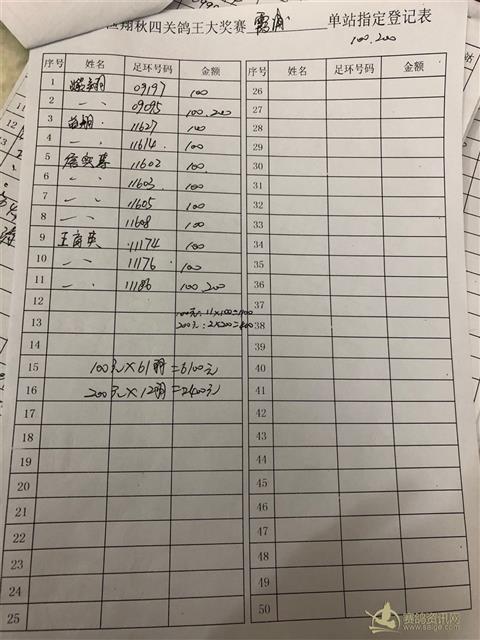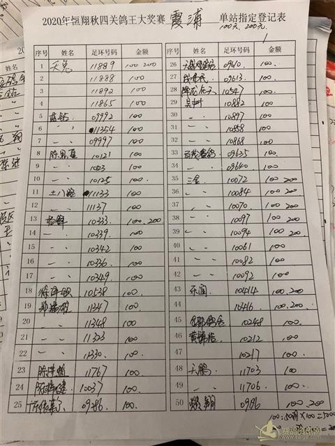 2020年恒翔秋四关鸽王大奖赛霞浦单站指定登记表