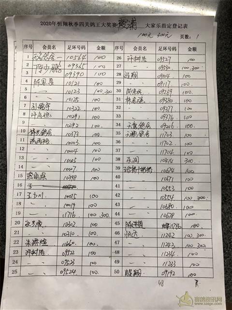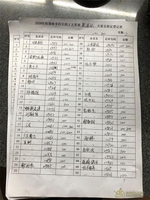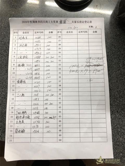2020年秋四关鸽王大奖赛第二关霞浦站大家乐指定表