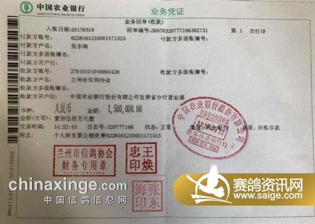 为了增加公棚的公信力,体现竞赛运动的公开透明,全力以赴办好第一届赛事,恒盛公棚已按照中鸽协,兰州市鸽会要求,将一百五十万元保证金打入市鸽会指定账户,本届比赛市鸽会将派四到八名裁判和鸽友代表全程一同严格执裁,我公棚全力支持配合裁判工作,打造兰州顶级赛事,让鸽友赛的省心放心舒心。