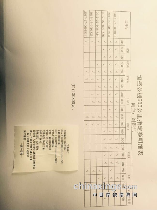 大西北恒盛爱心国际赛鸽公棚前五名指定缴费凭证