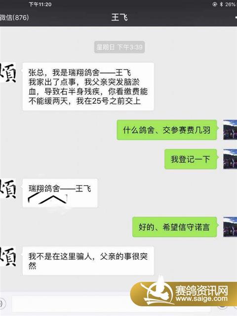 关于鸽友王飞推迟缴费公告 尊敬的恒盛会员们; 因鸽友王飞父亲突发脑溢血,无法按时缴费,公棚经商议决定延迟一个月的缴费时间,希望鸽友们对公棚的决定都能予以理解! 大西北恒盛爱心国际赛鸽公棚 2018年10月23日