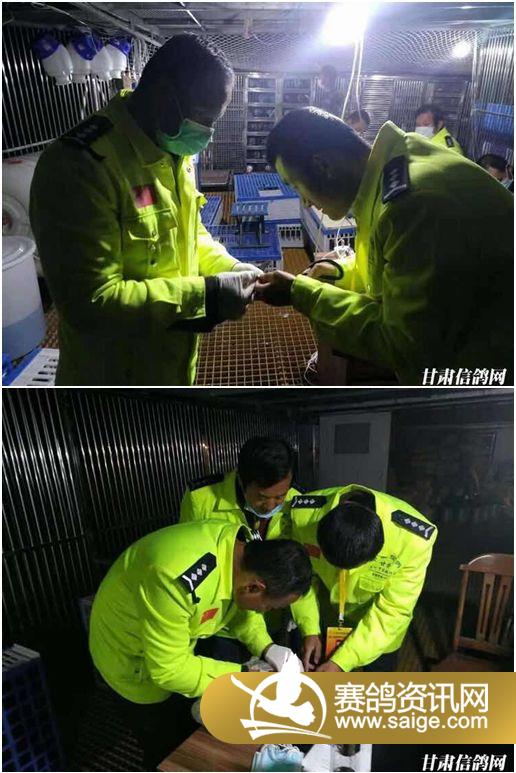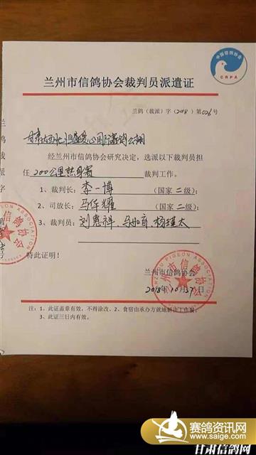 2018年10月27日,兰州市信鸽协会指派,由李一博担任裁判长的一行五人裁判组,赴大西北恒盛公棚抵达苦水恒盛公棚。 执裁派遣证 裁判员统一着装,持证上岗 执裁前公棚工作人员与裁判员合影 裁判员对防逃网、车辆等进行集鸽前检查 裁判员宣布恒盛200公里热身赛集鸽开始 裁判员与公棚工作人员共同进行赛鸽上传并同步进行网络直播 对发现的内套特比环进行处理,对赛鸽逐羽加盖暗记章,随机抽取铅封。 集鸽长监督赛鸽上笼,并对已装车的赛鸽进行铅封 集鸽完毕对集鸽电脑进行封存、销毁暗记章并进行查棚 出发前合影 2018年10月27日18时至次日凌晨3时,受兰州市信鸽协会的指派,赴恒盛公棚200公里热身赛裁判组一行五人,历经九个小时的苦苦坚持,完成了集鸽工作,共计集鸽4557羽,其中更换电子环5羽,更改羽色1羽。此次集鸽,逐羽上笼,加盖暗记,为了一鼓作气,裁判组克服天气寒冷,连续作业,特别是红古马华耀、马如育两位裁判员,集鸽刚刚结束又踏上了监放的路途,他们为了全国参赛鸽友的付出是值得肯定的,也是我们兰州市信鸽协会的“正能量”,两“马”监放,裁判组预祝全国参赛鸽友“马到成功”,愿司放人员安全返回。 到达司放地 准备开笼 早8点26分裁判员宣布恒盛第一关热身赛开笼 监放单 赛鸽归巢