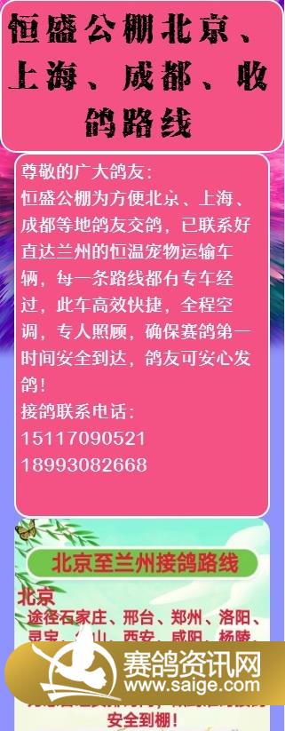 大西北恒盛公棚北京、上海、成都收鸽路线
