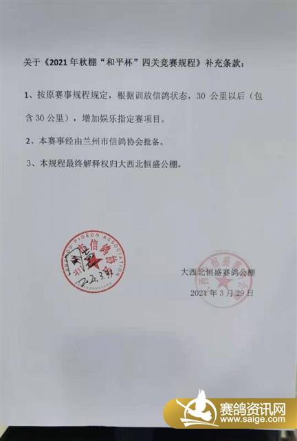 关于《2021年秋棚“和平杯”四关竞赛规程》补充条款