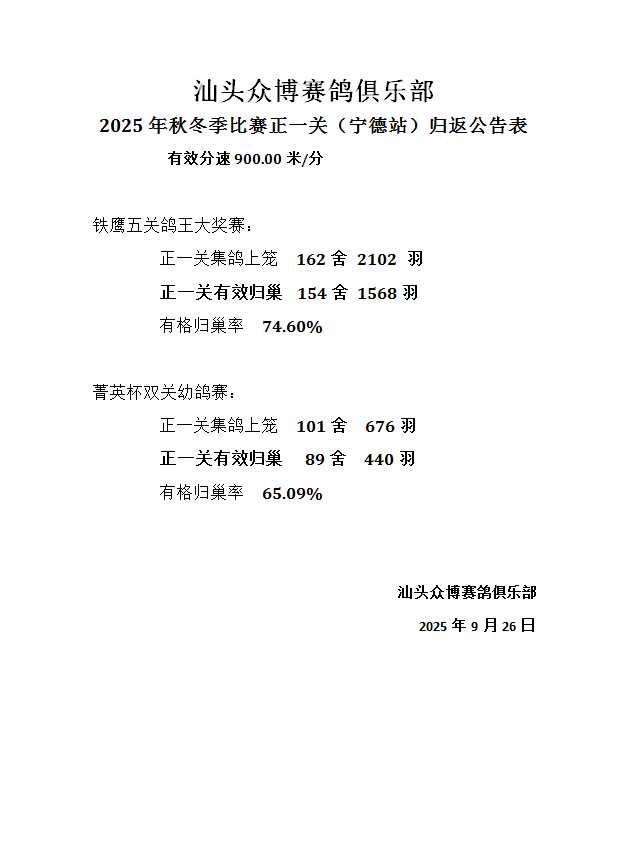众博2025年秋冬季正一关(宁德站)归巢公告及有效归巢清单